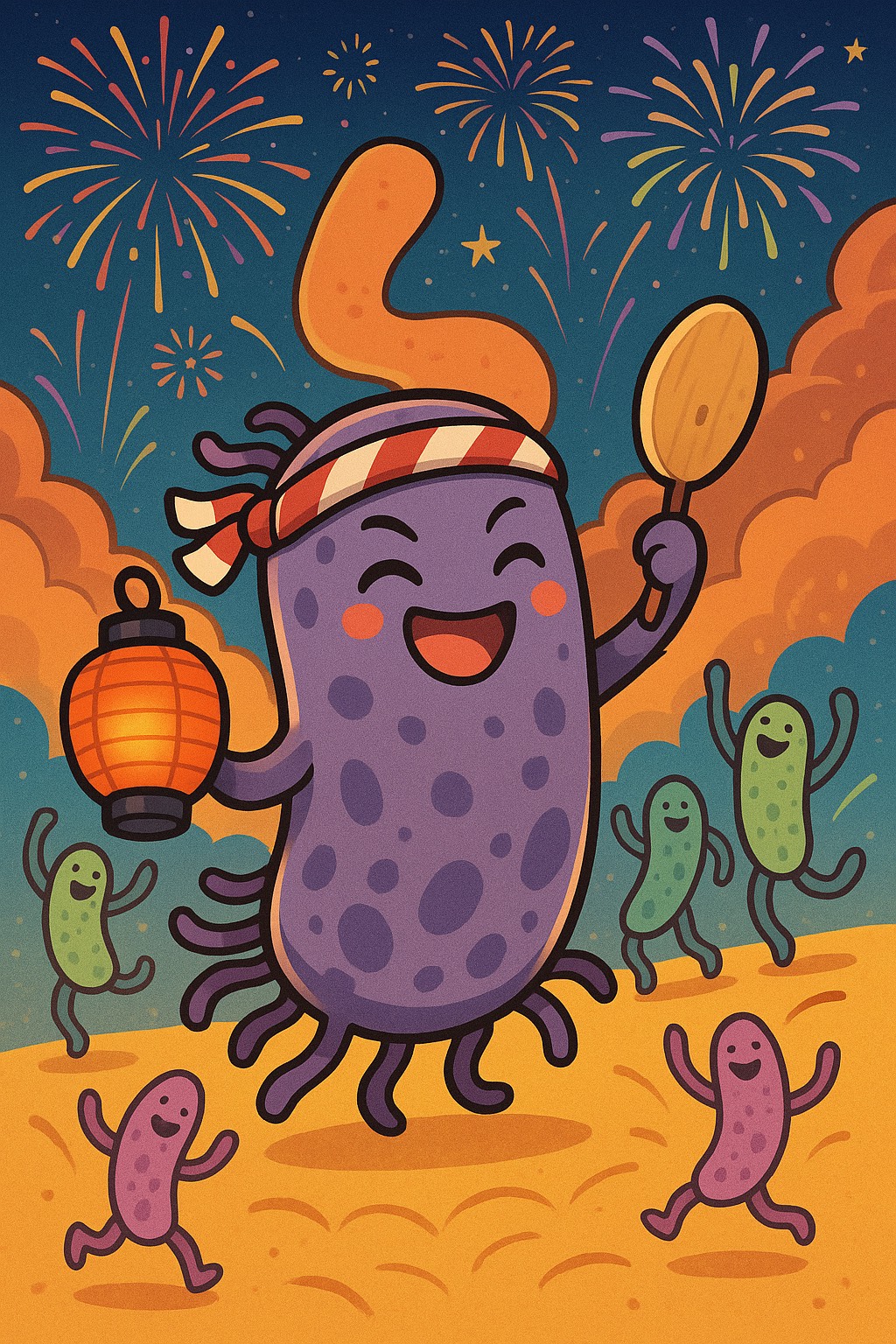 Upbeat J-POP with festival vibe, bright female vocal, Tempo: 118–125 BPM, Blend traditional Japanese festival sounds (taiko drums, shamisen, shakuhachi, festival chants “wasshoi!”) with pop-rock band, Add playful marimba and clapping for parade mood, Song theme: “Bacteroides plebeius / Phocaeicola plebeius”, a gut microbe that digests nori (porphyran) thanks to porphyranase from horizontal gene transfer, Lyrics must be cheerful and educational, mixing fun science words (porphyran, agarase, PUL, horizontal transfer) with Japanese cultural images (nori, rice, matsuri, wagashi, Edo, taiko parade), Call-and-response in bridge, like a matsuri shout, Final chorus should feel like a big matsuri finale with everyone chanting together, No dark tone, no instrumental-only track, must be bright vocal-focused