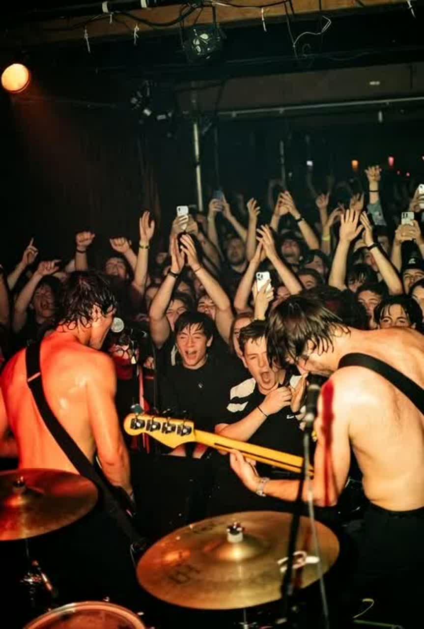 Up-tempo 2000s British garage rock revival, driving crunchy distorted power chord guitar riff, energetic fast-paced drums with snappy snare, raw gritty male vocals with distinct British accent and spoken-sung delivery, post-punk edge, punchy walking bassline, jagged lead guitar fills and occasional feedback, reverb-soaked guitars in choruses, anthemic soaring gang backing vocals, rebellious chaotic energy, urgent tempo around 150-160 BPM, raw lo-fi production with slight distortion, melodic yet gritty hooks, building intensity from verses to explosive choruses, fading chaotic outro with echoing vocals and feedback