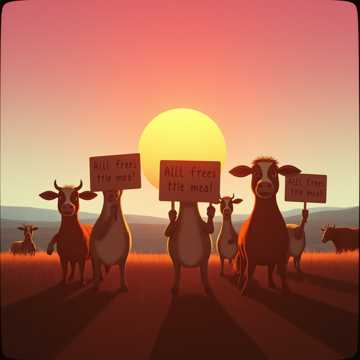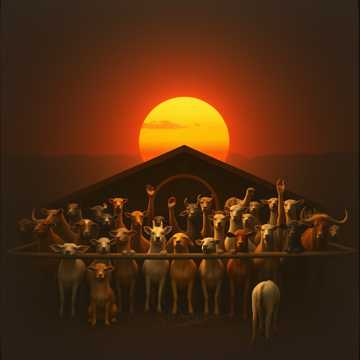 A dark electro-chanson with cinematic protest mood, Deep analog basslines, industrial percussion, and hypnotic looping rhythm, Mix elements of French chanson, darkwave, and electro-rock, Accordion, electric guitar, and strings intertwine with haunting synth pads, Male-female duet vocals alternate between spoken word and melodic chant, Add powerful SATB choir in refrains for dramatic irony, Include multiple instrumental breaks, solos (violin, horn, guitar), Wide stereo, Dolby Atmos-style depth, warm tape saturation, and ambient barn sound design, Moody yet strangely danceable — a modern Animal Farm elegy