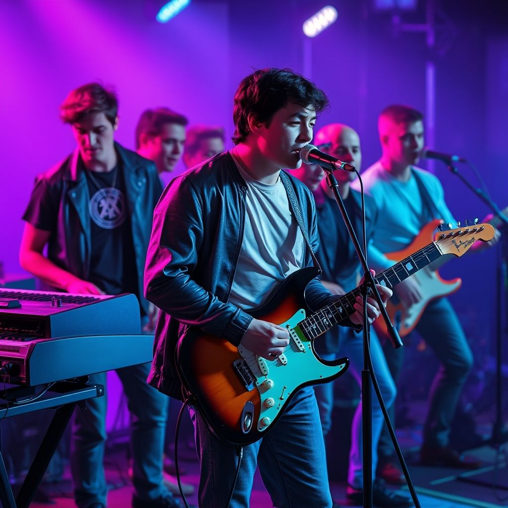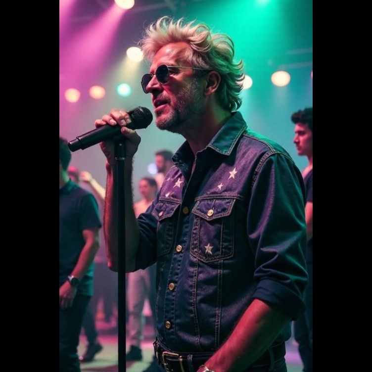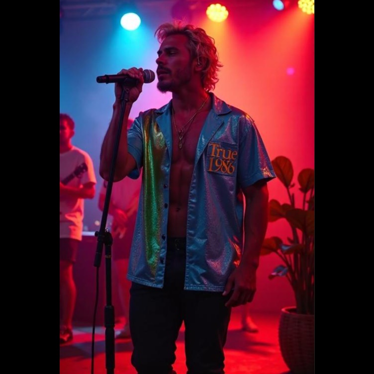 A synth-pop Europop track features Juno-106 pads, DX7 bell melodies, and Korg M1 stabs, with Roland TR-707 syncopated beats and crisp EDM percussion, Moog vocoder layers soulful Latino vocals (noise/sawtooth, 8–20 bands) for robotic harmonies, Dual melodic male vocals—mixing falsetto and R&B with panning—ride atop lush major-key pads, Eurodisco stabs, uplifting Italo Disco grooves, tubular bells, and driving 80s punk-inspired new wave synths, crafting an energetic, nocturnal, and emotive Eurodance atmosphere