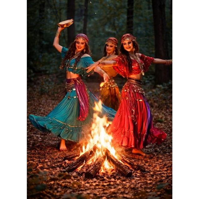 Traditional Romani, Primal, ritualistic instrumental driven by rhythm above all else, Opening with solo frame drum and low hand percussion (deep pulses, uneven accents, human imperfections), evoking footsteps on dry earth, Gradually layer foot stomps, claps, and breath-like shakers, creating a tribal groove that feels lived-in, not polished, Violin and acoustic guitar enter sparingly, not as lead virtuosity but as responders to the drum—short, raw phrases, slides, bends, and improvised cries that circle the rhythm rather than dominate it, Mid-section intensifies: polyrhythmic drumming, call-and-response between high claps and low drums, tempo surging like a communal dance around fire, Minimal cinematic drones or low strings add gravity and ancestral weight without modern gloss, Final passage strips back to heartbeat drums and fading stomps, unresolved, as if the rhythm continues beyond the track—movement without end, pulse without borders, ‑Electronic sound