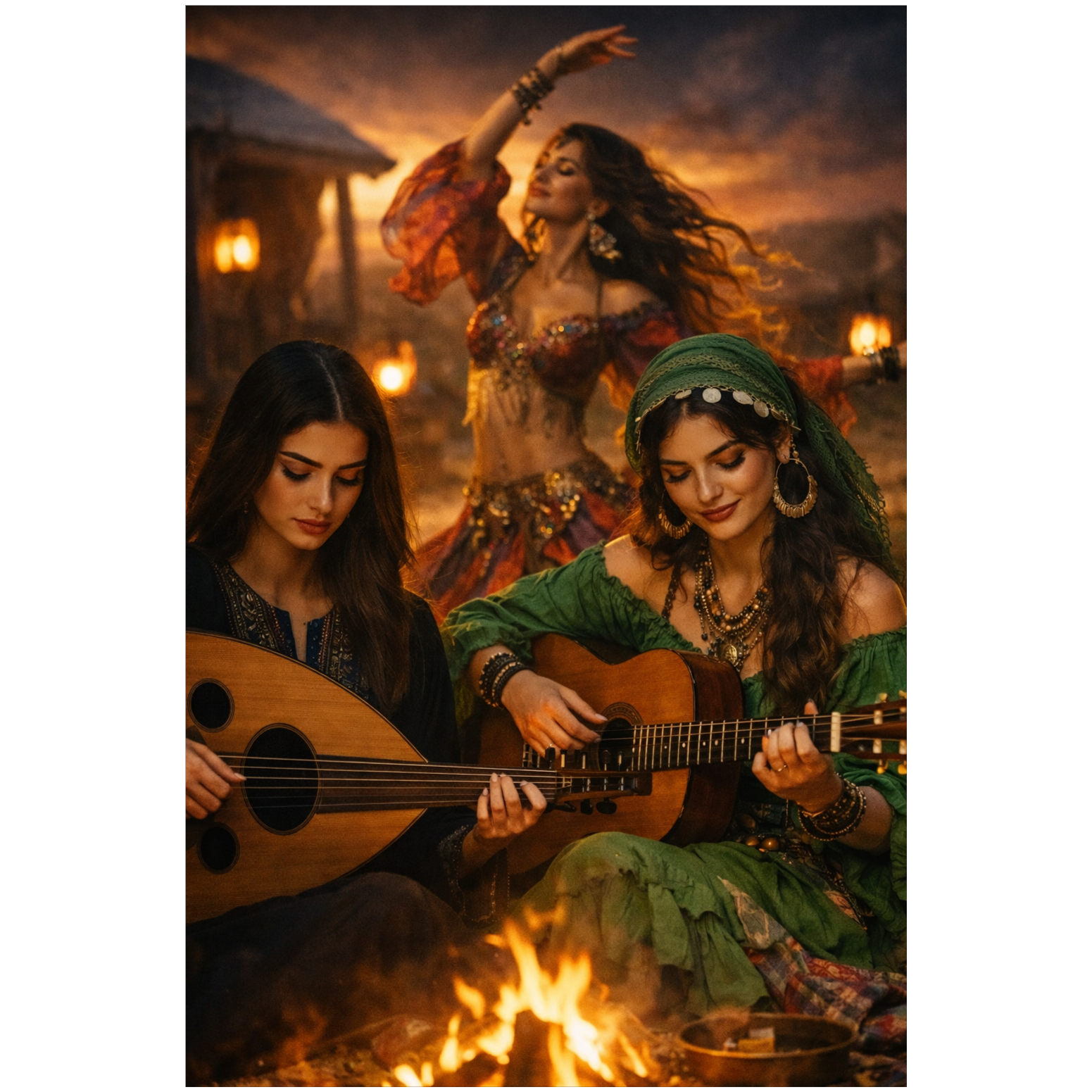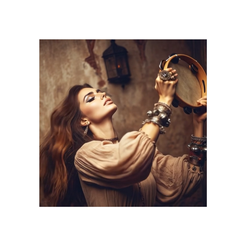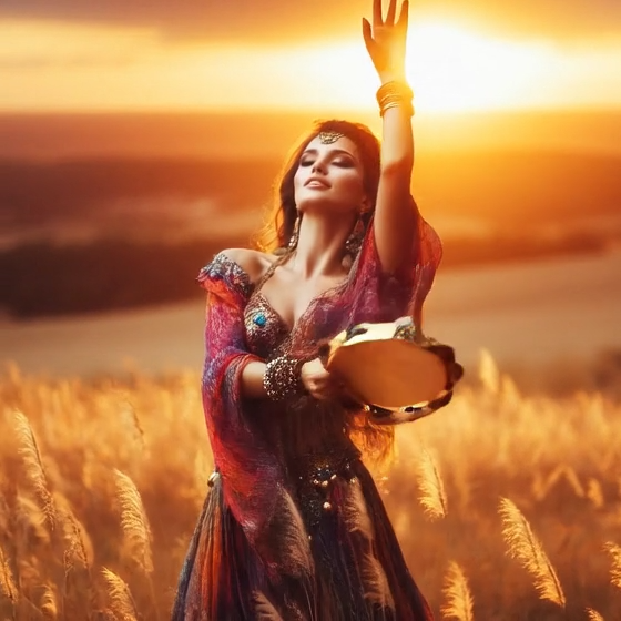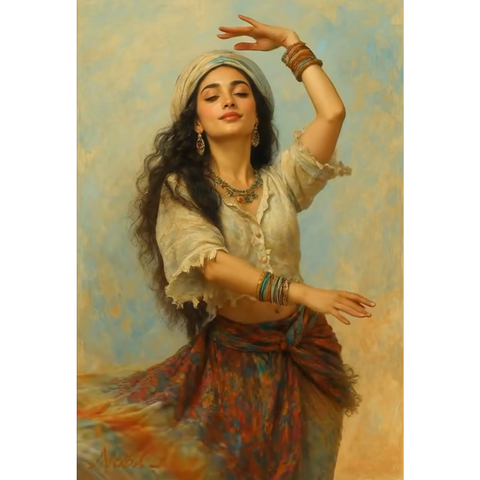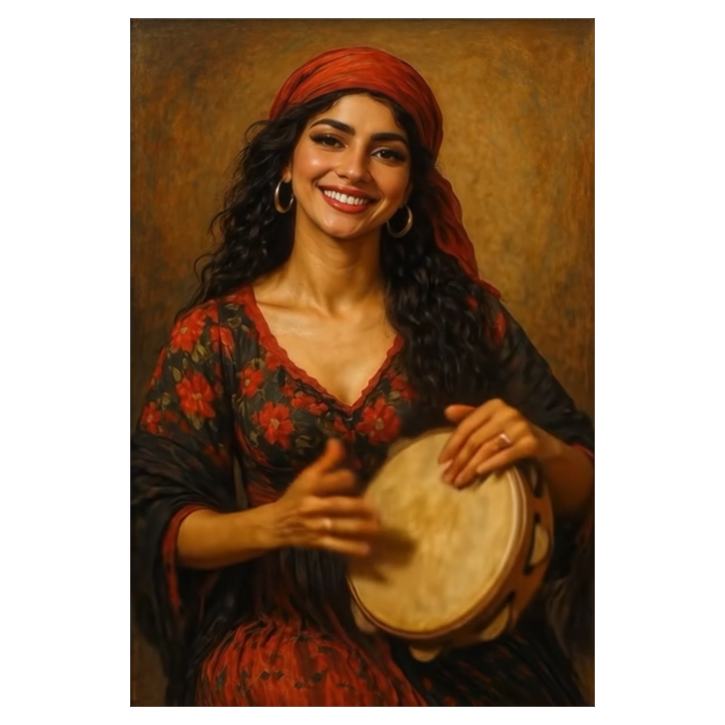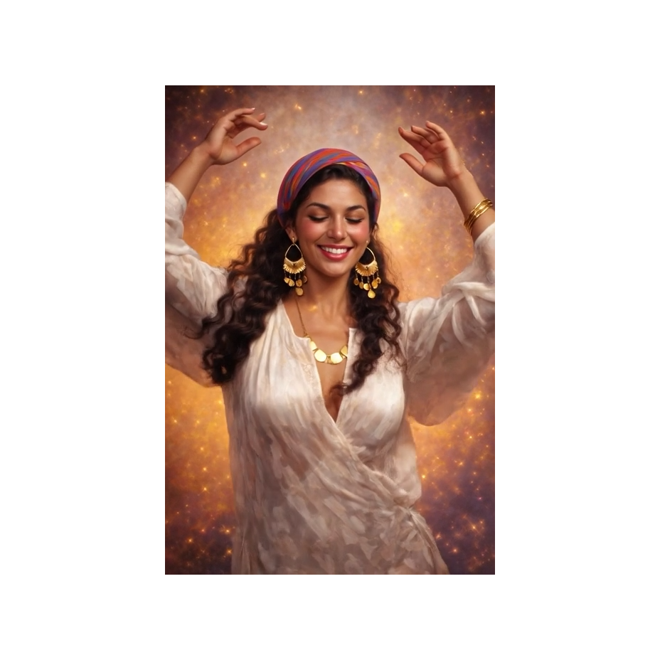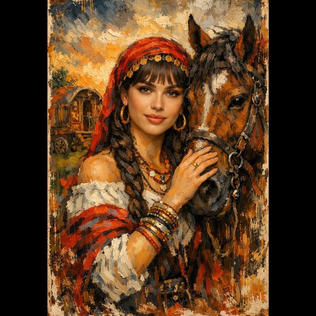 Traditional Romani instrumental, lively and deeply emotive, featuring acoustic violin as the lead voice with intricate, expressive slides and microtonal ornamentation, Accompanied by rhythmic acoustic guitar, hand percussion, foot stomps, and handclaps to create trance-like grooves for dancing, Simple, repetitive melodic motifs that emphasize pulse over harmony, with sudden pauses and dynamic swells, Evokes traveling life, campfires, celebration, love, and sorrow, Flexible instrumentation: voice, violin, guitar, spoons, oud, accordion, Raw, heartfelt, improvisatory, with cross-cultural influences from Eastern Europe, the Middle East, and Andalusia