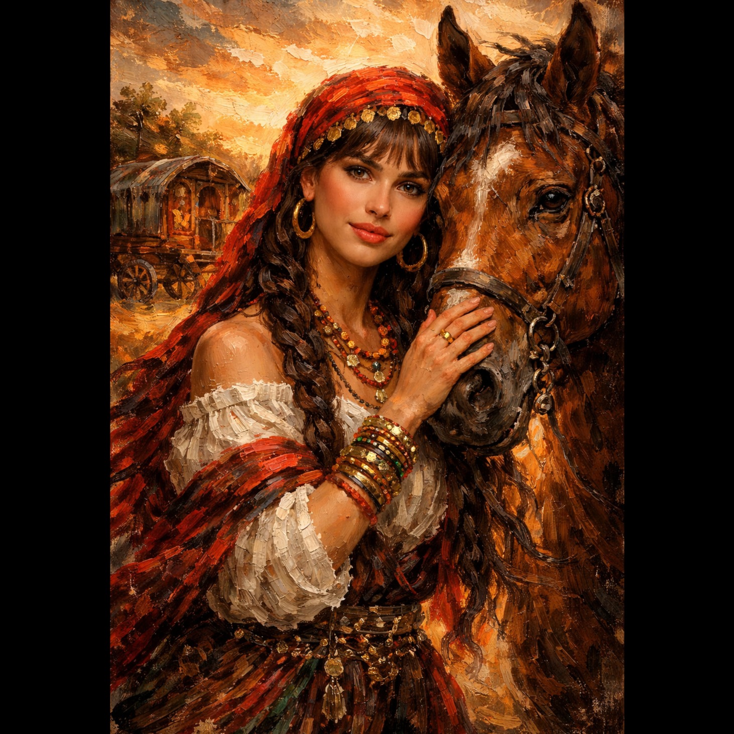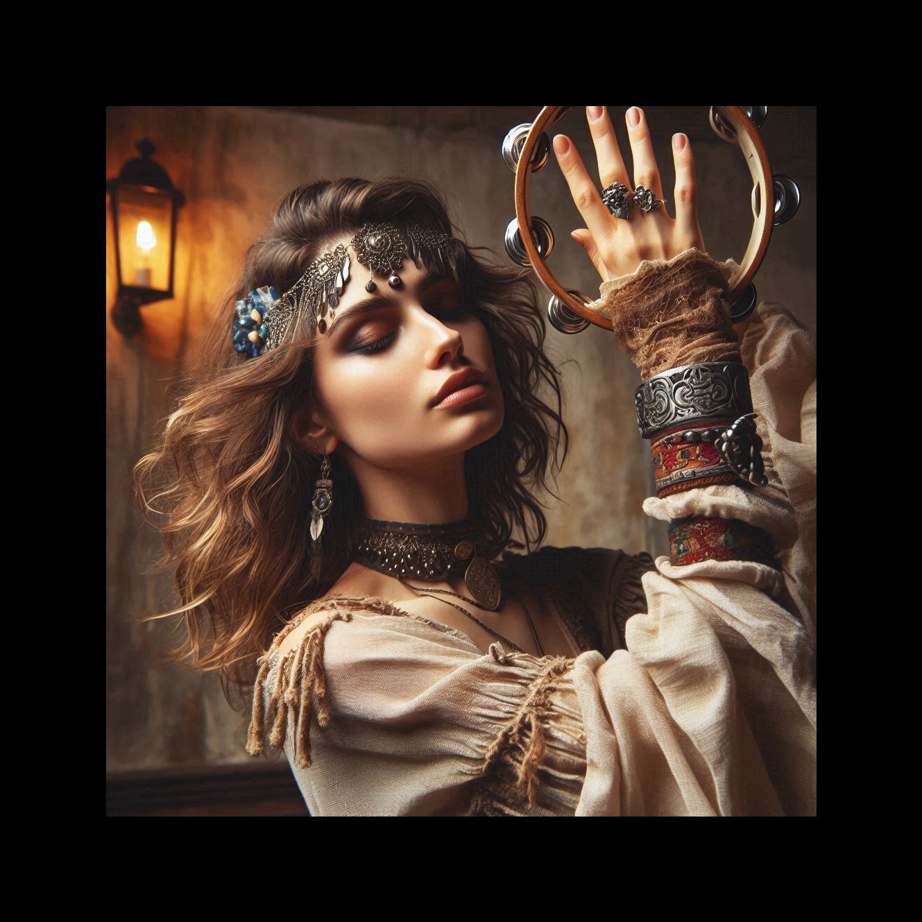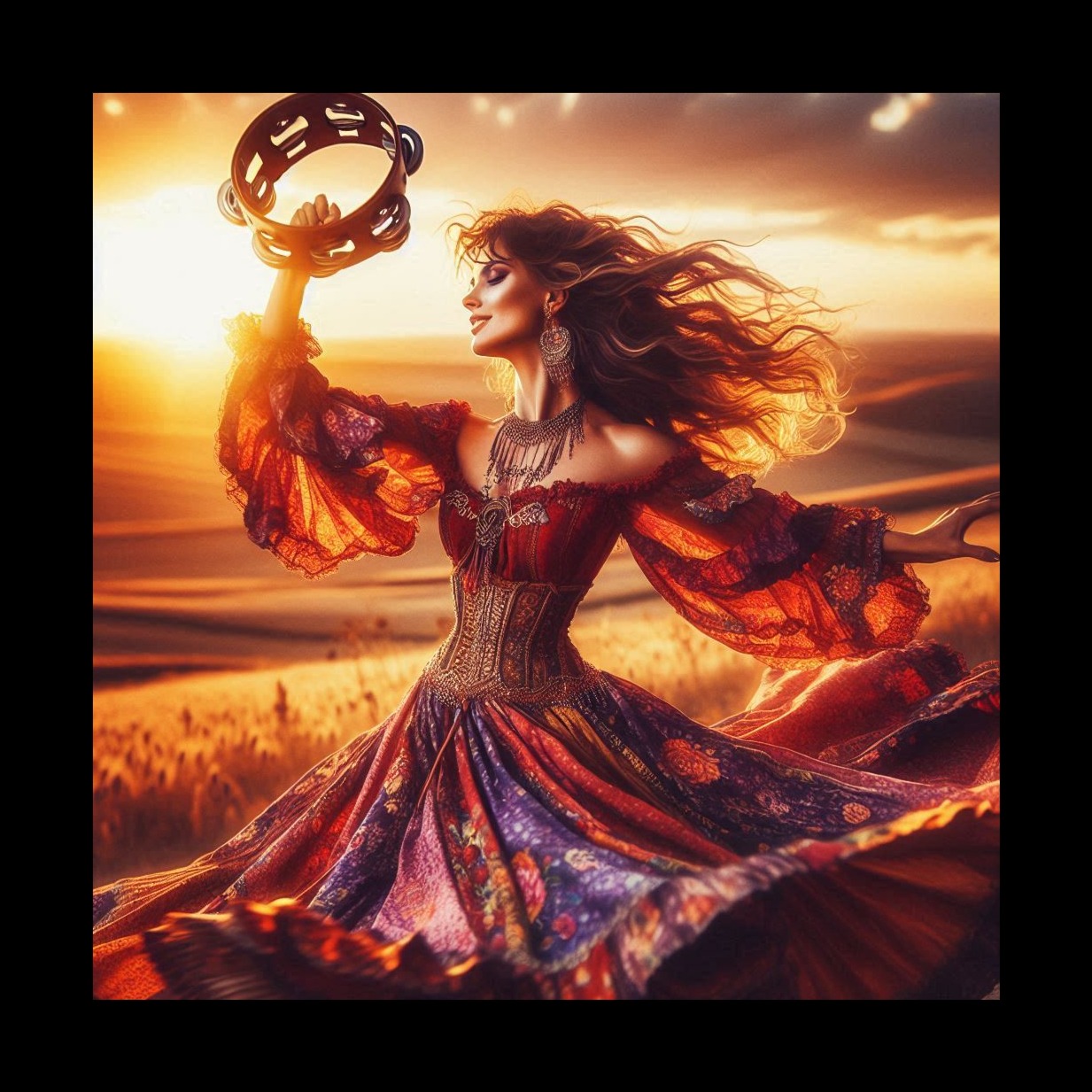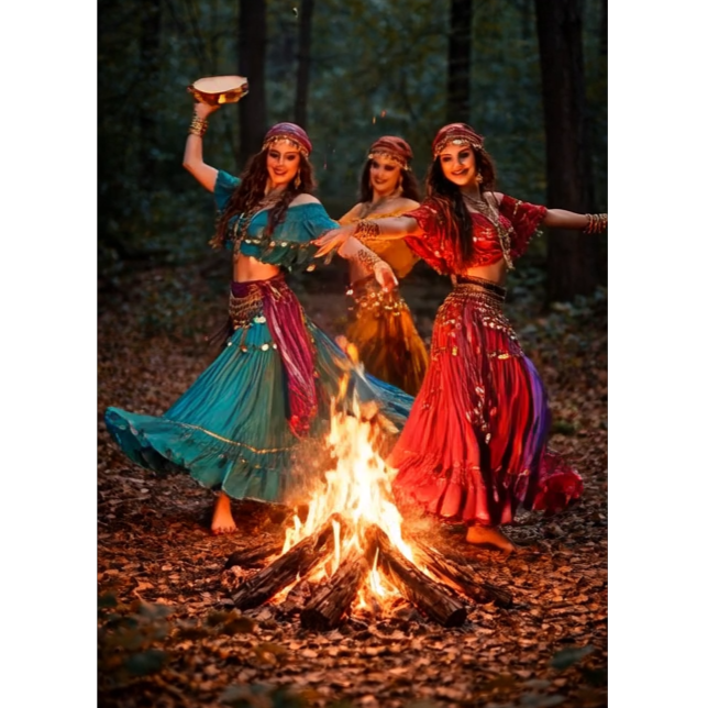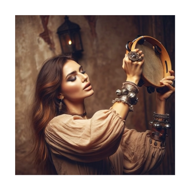 Traditional Romani instrumental, lively and deeply emotive, featuring acoustic violin as the lead voice with intricate, expressive slides and microtonal ornamentation, Accompanied by rhythmic acoustic guitar, hand percussion, foot stomps, and handclaps to create trance-like grooves for dancing, Simple, repetitive melodic motifs that emphasize pulse over harmony, with sudden pauses and dynamic swells, Evokes traveling life, campfires, celebration, love, and sorrow, Flexible instrumentation: voice, violin, guitar, spoons, oud, accordion, Raw, heartfelt, improvisatory, with cross-cultural influences from Eastern Europe, the Middle East, and Andalusia