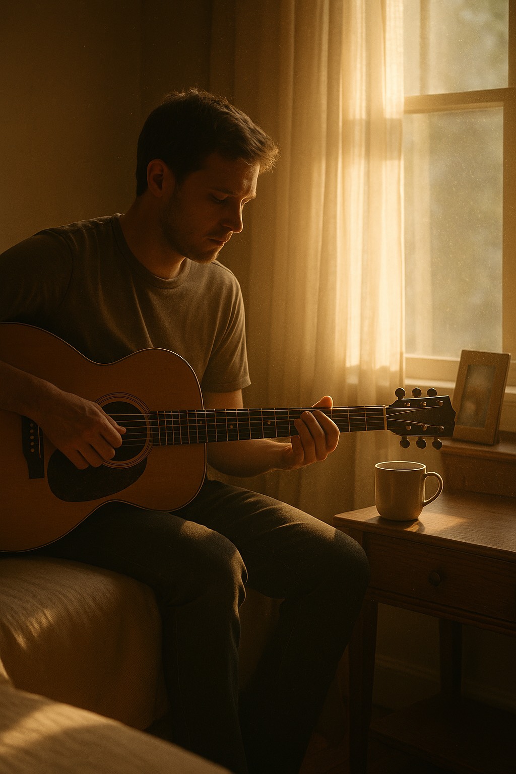 A minimal acoustic pop-folk ballad (82 BPM) built on gentle fingerpicked acoustic guitar and a warm lo-fi recording tone, Solo male vocal—low, breathy, intimate, and raw, carrying tenderness rather than power, No drums or backing layers; just voice and guitar breathing together in a sunlit room, The sound feels handmade and human, like a one-take confession recorded at golden hour, Thematically it reflects on love, aging, loss, and gratitude, focusing on saying everything while there’s still time, The mood is nostalgic yet peaceful—accepting imperfection, celebrating what remains, Keywords: sunlight, mortality, devotion, honesty, warmth, imperfection, timeless love, gratitude
