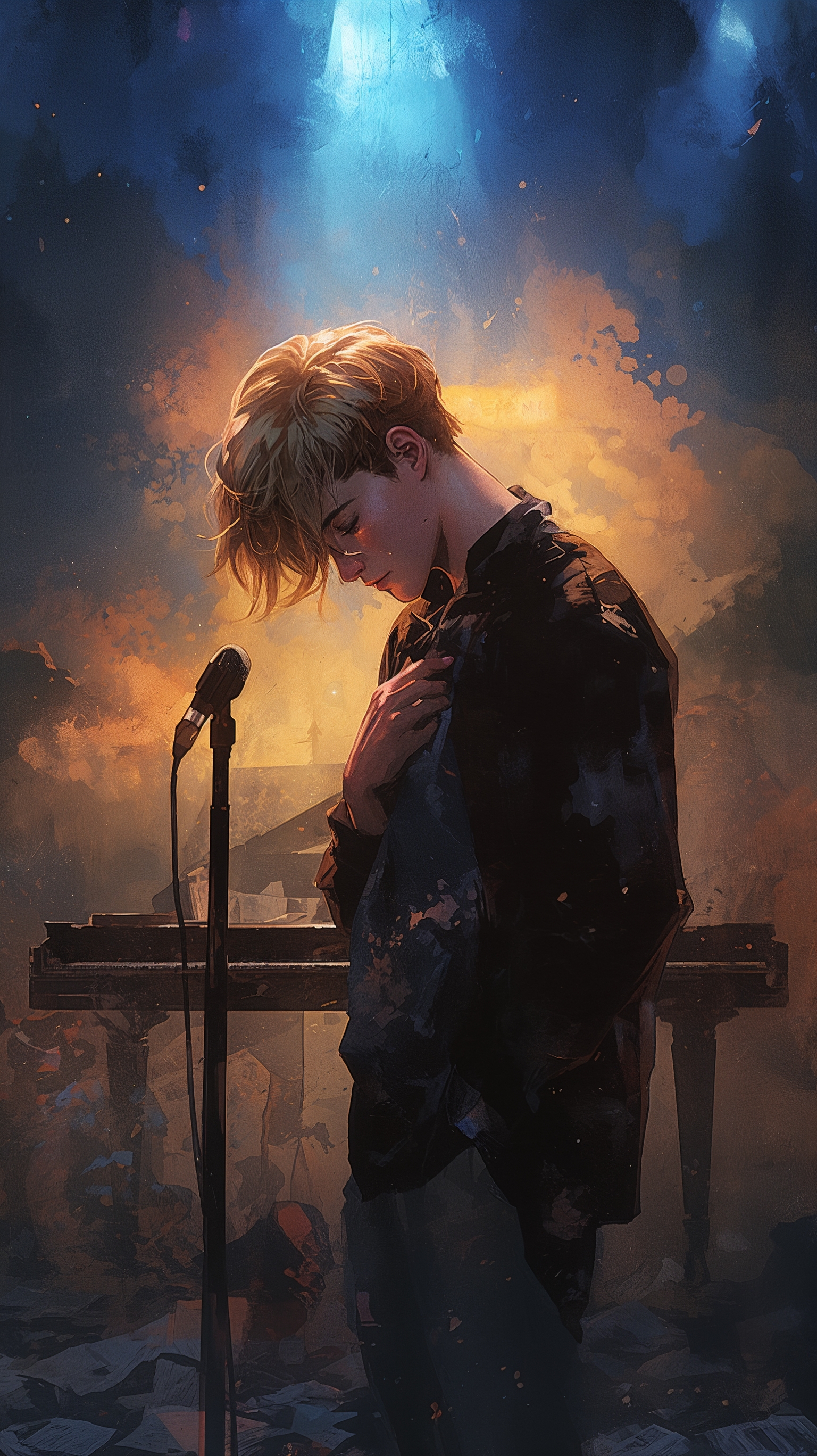 This high-tempo arrangement darkwave arrangement in B minor is built around a close-mic’d acoustic grand piano, rapid, restless, and relentless, driving the track with syncopated left-hand octaves, rolling sixteenth-note chords, shepard tones, and sharp dynamic accents, Rich, clear vocals move at a steadier, allegro pace, the voice floating above a turbulent accompaniment, Sparse verses lean on restrained piano pulses and low drones, with British new wave baritone delivery framed by three part polyphonic harmony and room reverb with high pass filtering, The choruses surge into dense piano crashes, distorted synth swells, and layered backing vocals that crack under strain, Reverse reverb tails, static, and guitar feedback haunt the mix, amplifying the sense of psychological claustrophobia, Dynamics pivot sharply: sudden drops to exposed voice and piano, then surging crescendos that fill the stereo field, The result is a dark, emotionally-charged art-pop fusion with alt 1990s intensity