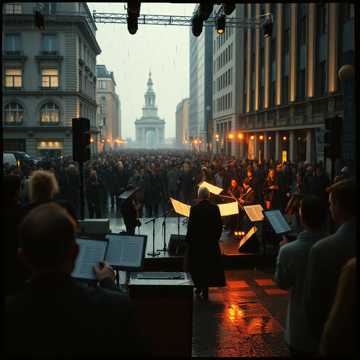 Create a cinematic US-German live concert hip-hop track at 125–158 BPM, Core: orchestral piano-rap with dramatic grand piano, lush string carpets, and warm brass, Rhythm: fat 808 bass, deep subs, 16th-kick drive, crisp snares, and double/quadruple marching-band snare rolls like a snare solo before drops, Add futuristic synth layers and subtle G-funk elements (soft leads, slow claps), Atmosphere: rain, thunder, reverb, risers, crowd energy, Vocals: male only, performed in Maron 5's melodic, emotional, fragile yet street-wise style, Verses: poetic rap and deep storytelling, Hook: massive male choir, warm gospel-like layers shaped into smooth 90s West Coast melody, catchy and heavy, Arrangement: intro with ambient rain and solo piano → strings rise → beat explodes with orchestral + electronic fusion → choir hooks with live-concert intensity, Concept: Sacred street symphony – an ancient-futuristic US-German performance uniting fire, funk, on stage crowd sings alone some parts of lines