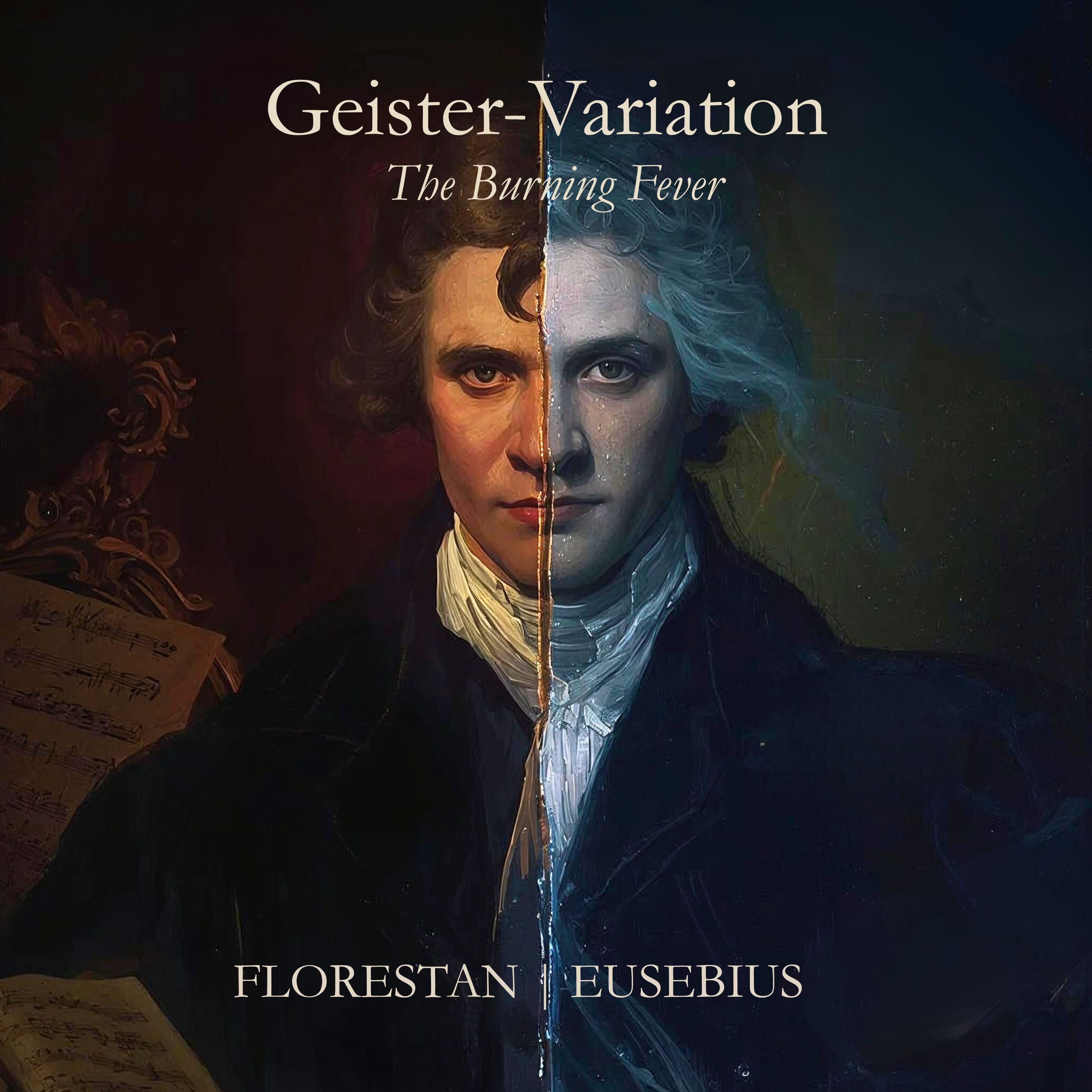 Dark Romantic Art-Rock × Neo-Classical Piano, Driving piano ostinato inspired by Schumann’s “Geistervariationen” in E-flat, combined with dramatic drums, deep warm bass and subtle distorted guitars, Medium tempo (around 95–110 BPM), in 4/4 or 6/8, with sharp dynamic contrasts, The mood is intense, haunted, and feverish, but still lyrical and melodic, Vocals should be passionate, slightly unstable, with emotional outbursts, No metal, no EDM – more like cinematic rock with a tortured Romantic soul