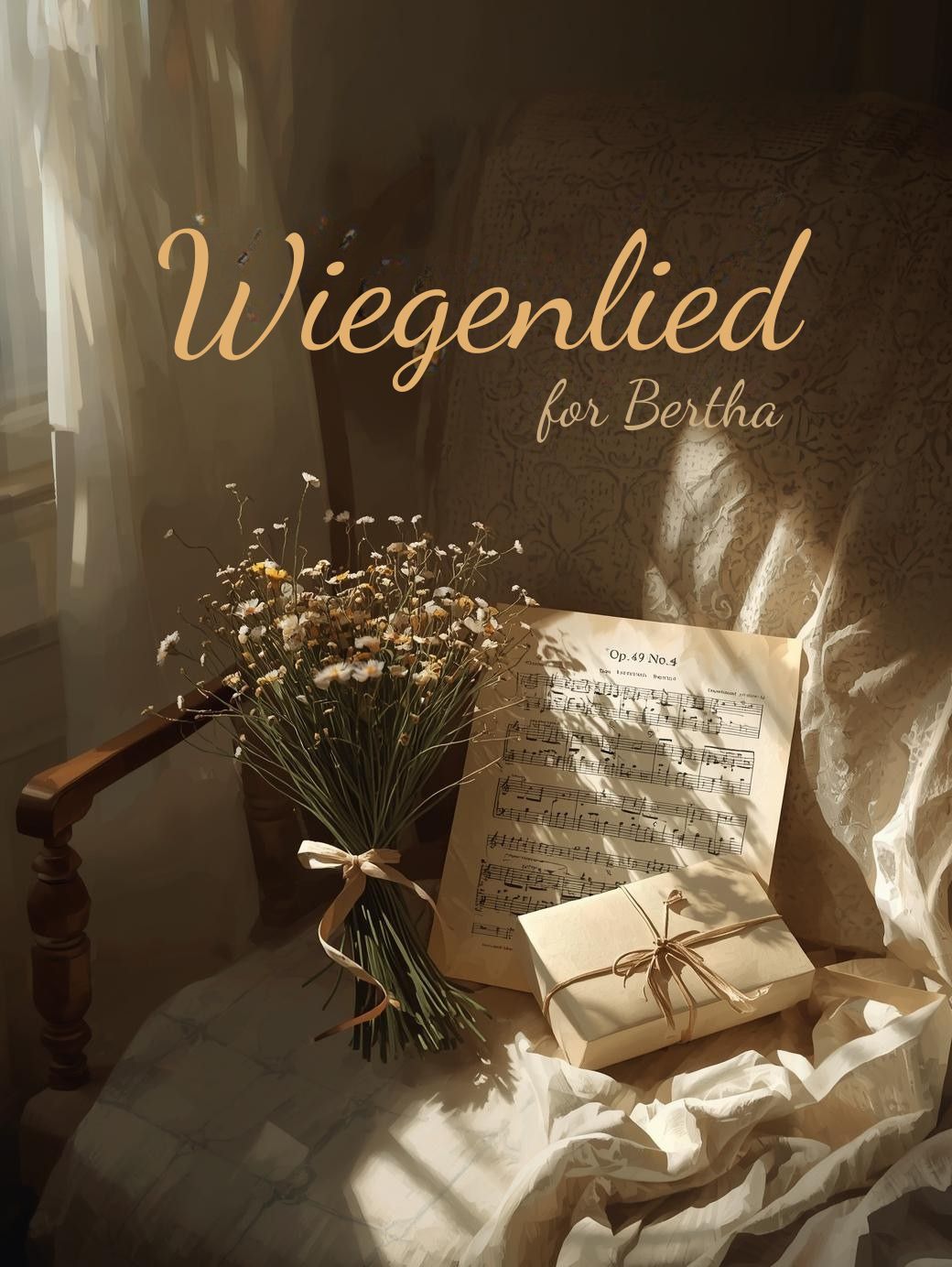 The neo-classical waltz opens with solo violin stating the familiar minuet melody, piano gently doubling lower strings for subtle support, The quartet trades melodic fragments with airy textures, keeping dynamics soft and articulation expressive, Cello underpins with restrained warmth, while inner strings offer passing counterpoint, Voice floats intimately above, weaving English and German lines, blending into the ensemble for a unified timbre, Delicate rubato and understated dynamics allow space and warmth, culminating in a hushed, heartfelt coda