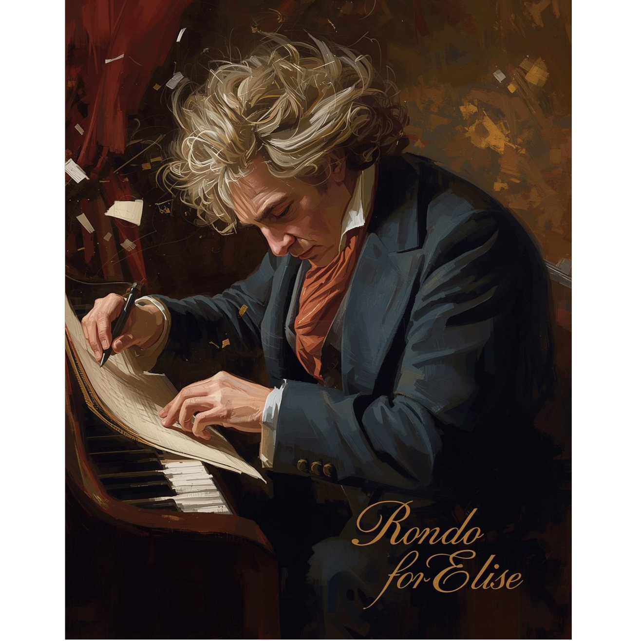 Inspired by Beethoven’s “Für Elise”, The music should feel circular and emotional, like a rondo that returns to its theme with hope and hesitation, Use bright piano arpeggios and light strings, with gentle acoustic percussion in 3/4 or 6/8 meter (around 90 BPM), The tone is romantic and wistful, not sad — like a letter that keeps rewriting itself, Vocal style: expressive male or androgynous voice, warm and intimate, showing tender self-doubt and affection