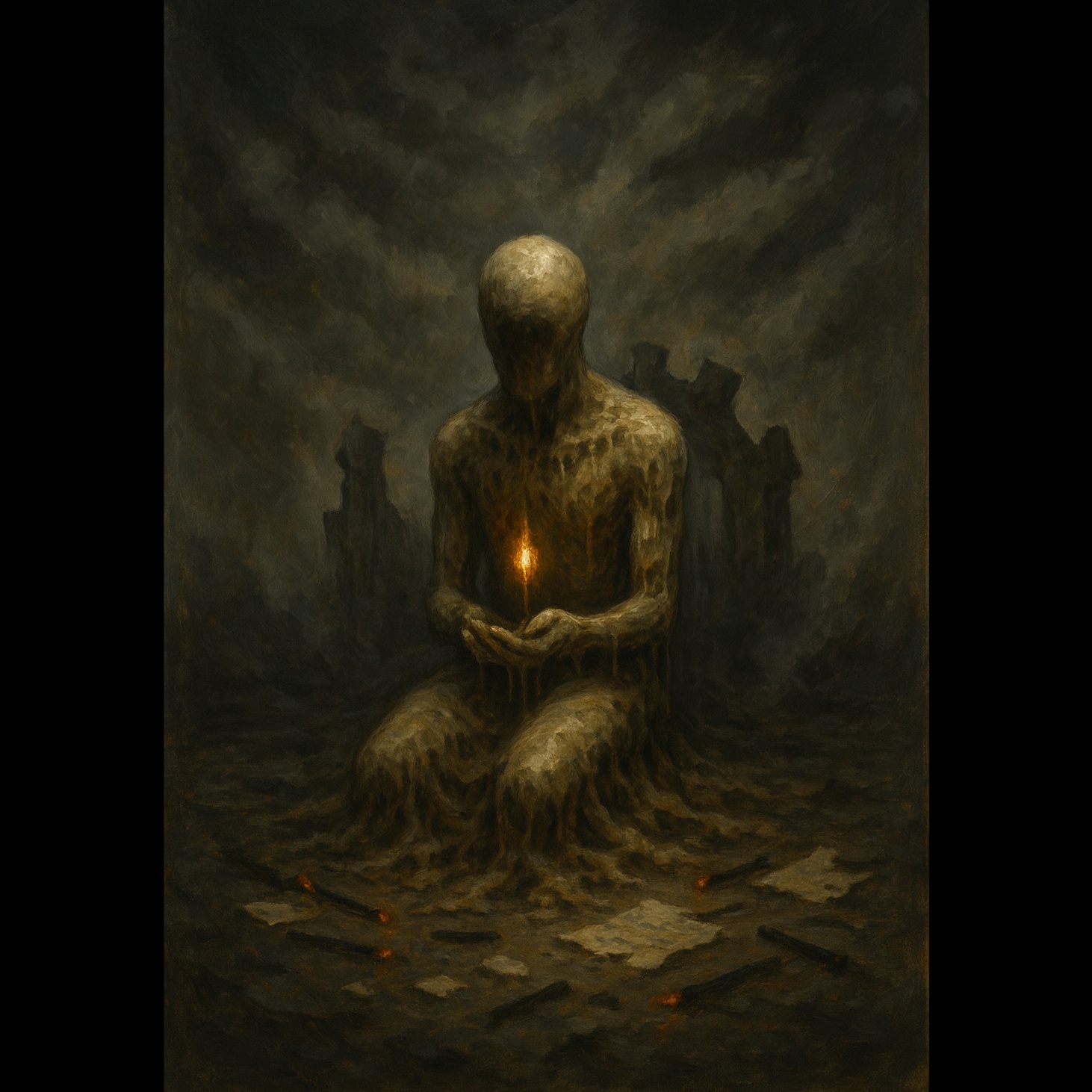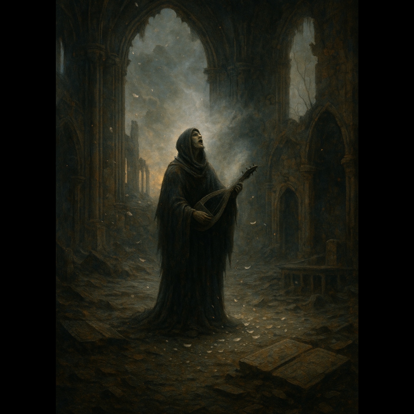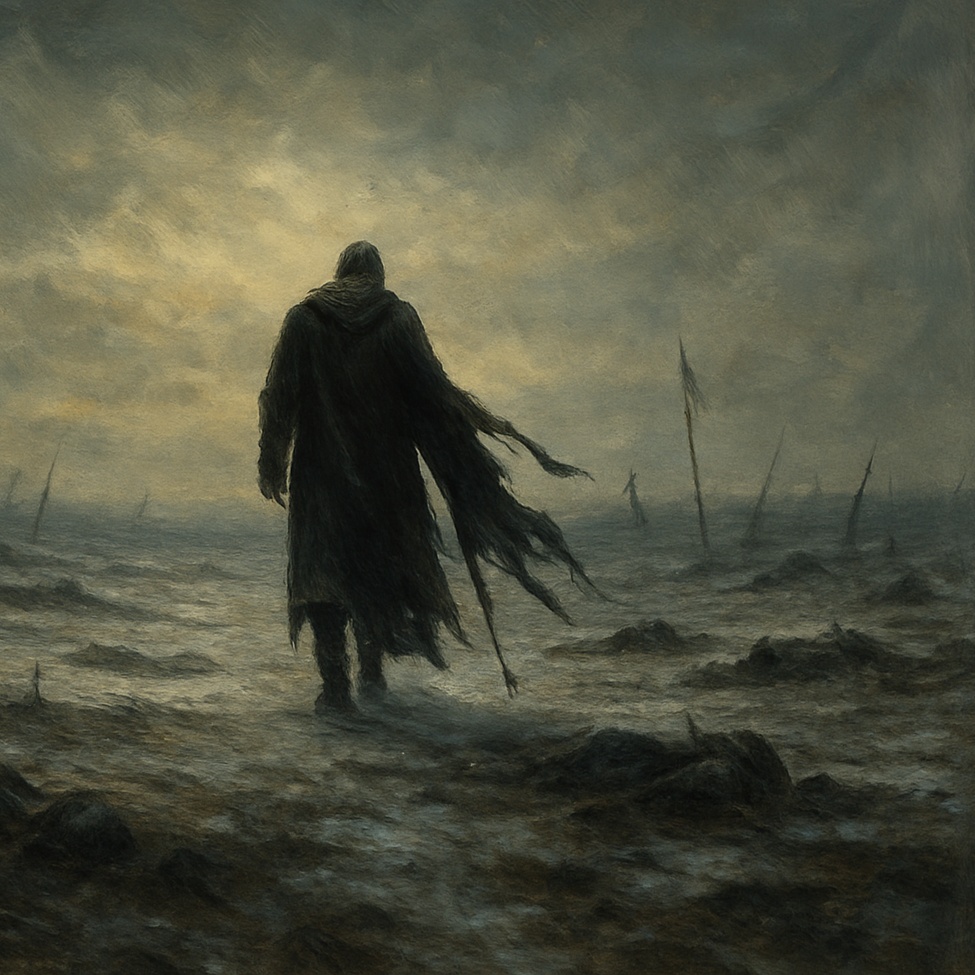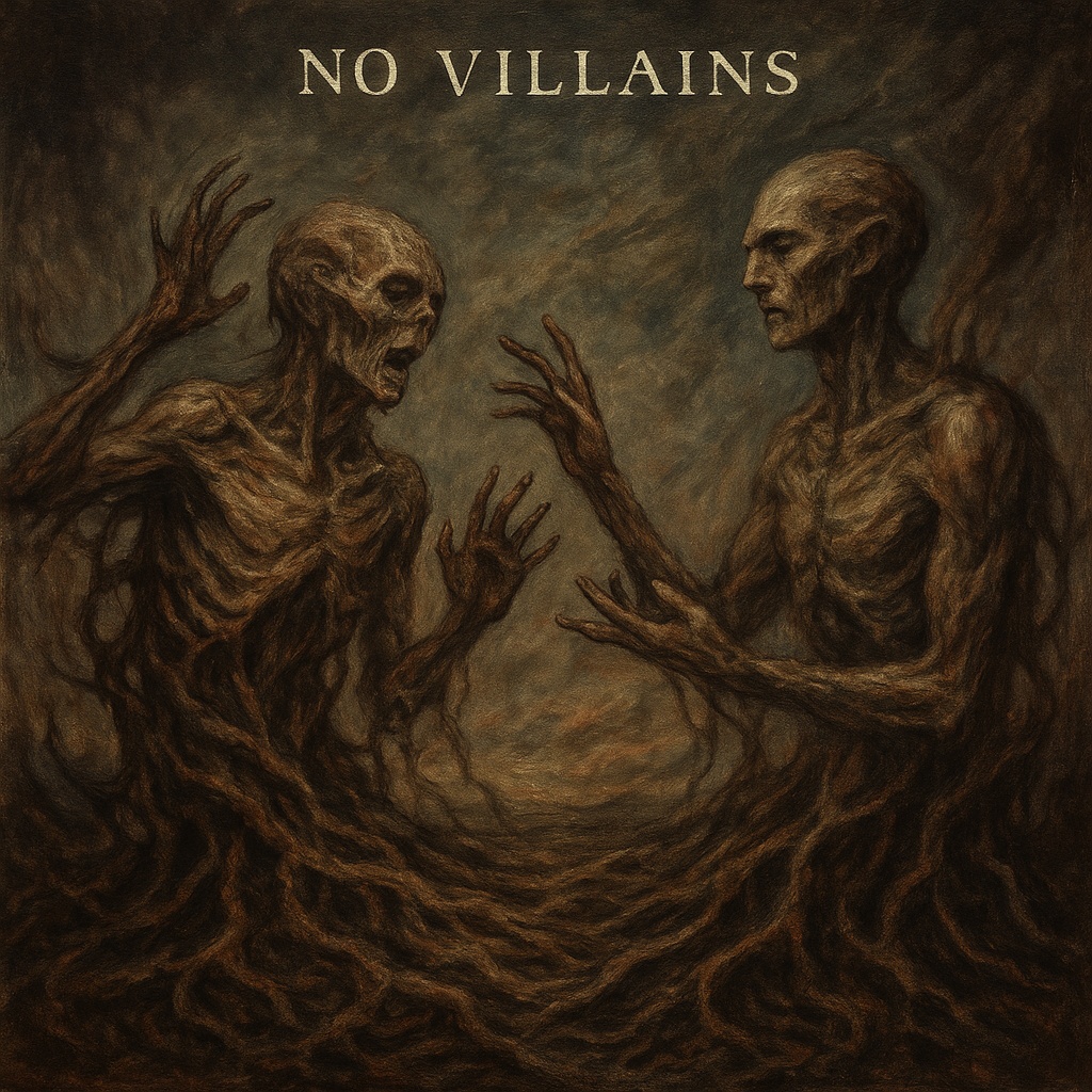 tragic beauty, inner conflict, existential grief, moral ambiguity, quiet defiance, shared suffering, shattered ideals, no villains