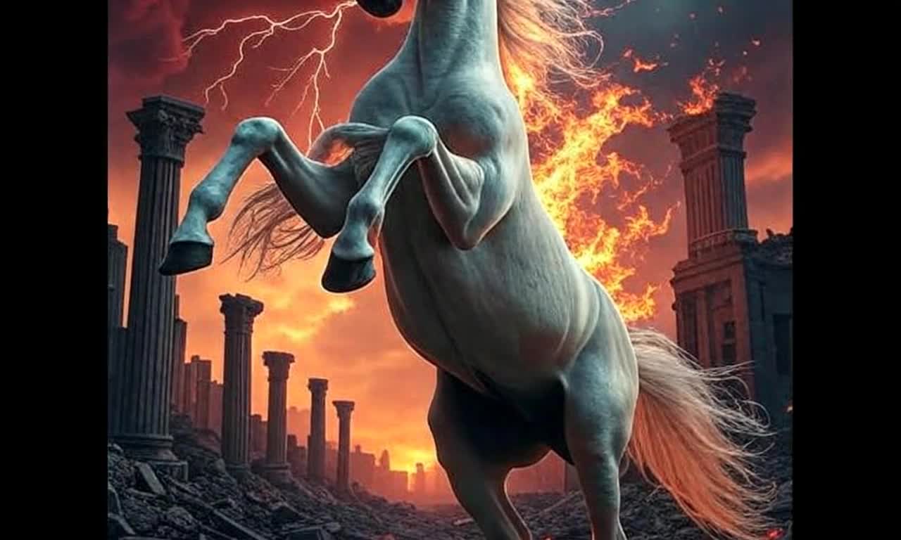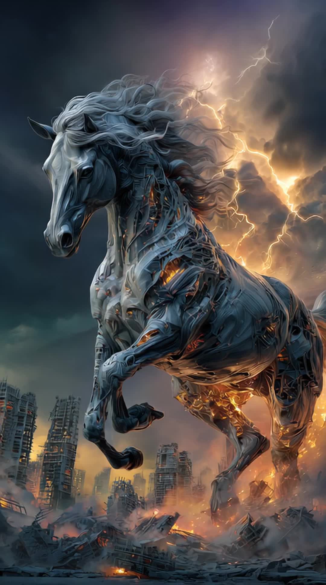 Blend epic, dramatic instrumental in the style of a edgy rock power ballad opera with Wagner orchestral tones, Open with striking, loud expressive piano for a cinematic triumphant sound, thunder and lightening, incorporating soaring violins, cellos, banjo, guitars, limit to 4 minutes, with a high-energy, theatrical vibe at 150 BPM, Build to powerful crescendos, The mood should be grandiose, evoking triumph, with a blend of raw rock energy and cinematic orchestration depicting a Valkyrie riding a warhorse sense of barely contained energy, as if the horse is on the edge of breaking through a fiery apocalypse