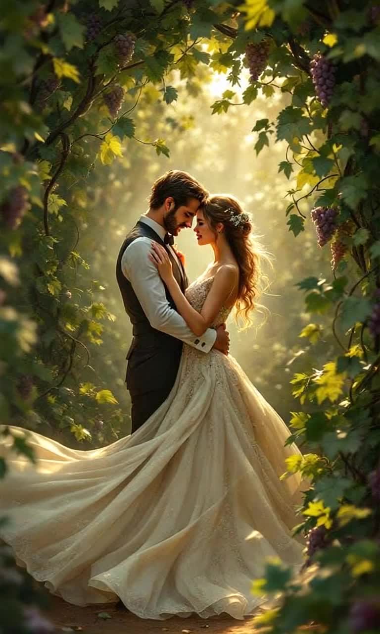 Instruments: Acoustic guitar with warm, fingerpicked arpeggios and slides for a tender vibe, Steel guitar with long, mournful slides for vintage twang, Upright bass with deep, steady pulses anchoring the groove, Fiddle with subtle, emotive fills in the chorus, echoing the vine’s growth, Brushed drums with soft snare in a slow 4/4 (60-70 BPM) for a danceable sway, Sparse piano with gospel-tinged chords adding warmth, Groove & Rhythm: Slow, waltz-like sway for a two-step dance, Deliberate rhythm with elongated notes and pauses, letting steel guitar and harmonies linger, Steady heartbeat beat with a downbeat push, Vocal Styles: Male baritone, gravelly and sincere, hopeful early, confident later, Female alto, playful with twang early, tender later, Chorus harmonies blend female’s high register with male’s low resonance, vine-like and emotional, Chorus: Simple, singable, vow-like, Subtle fiddle/piano swell, keeps intimate slow-dance vibe