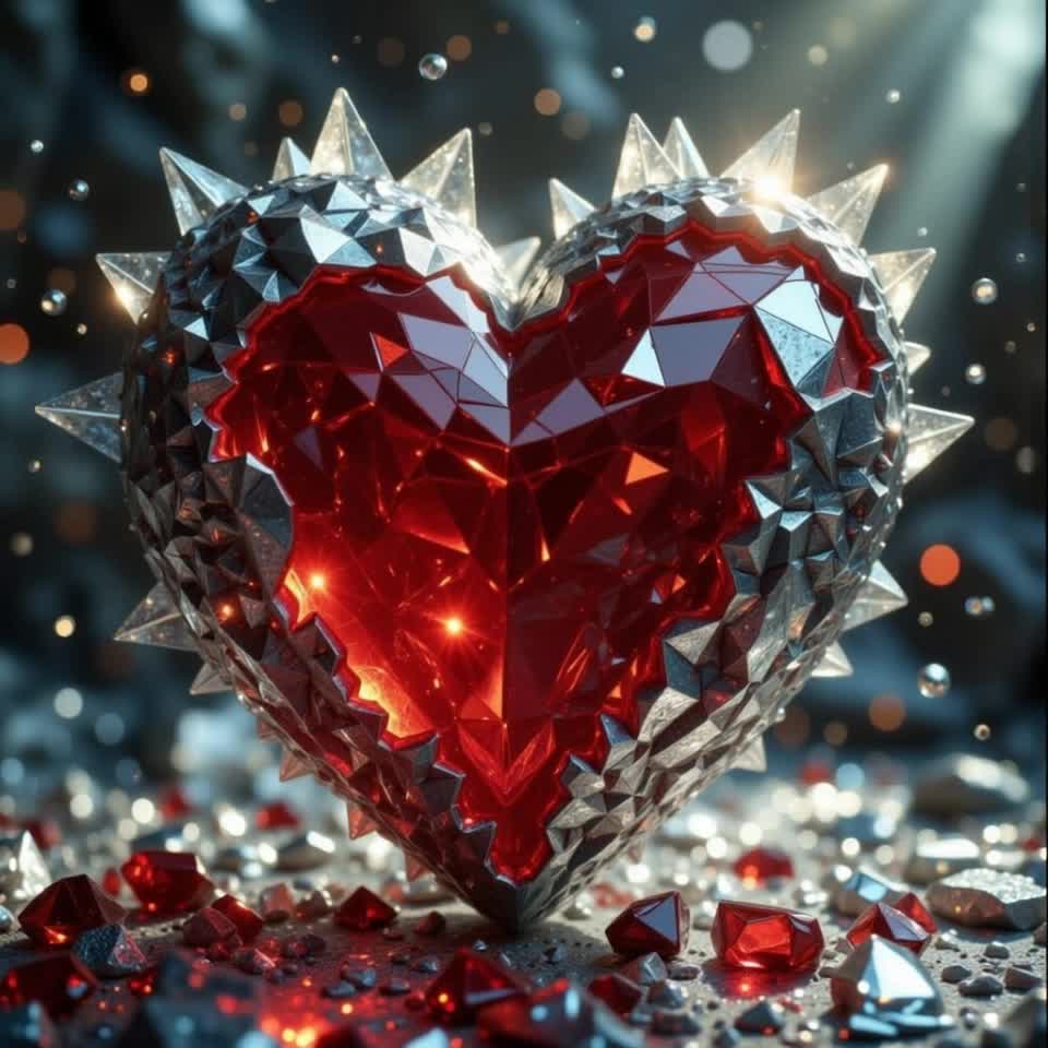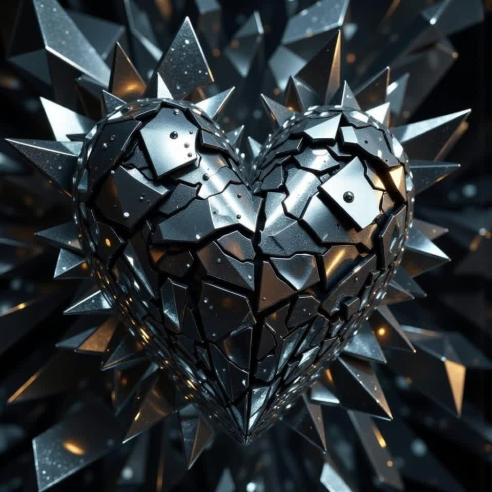 begins with a close-up of the heart, pulsating gently in a dark, softly lit environment with a subtle red glow, The heart then starts to crack with glowing fissures forming across its surface, emitting faint sparks, This builds to a violent explosion in slow motion, shattering the heart into countless jagged fragments that fly outward in all directions, glinting with a mix of red and metallic hues, The fragments move realistically, tumbling and spinning as they disperse into the void, with some trailing faint smoke or embers, The camera dynamically follows the explosion, zooming out slightly to capture the full spread of fragments while maintaining focus on their intricate details, The background remains dark with a faint misty atmosphere to enhance the dramatic effect, Use realistic physics for fragment motion, with a mix of fast and slow-moving pieces for depth