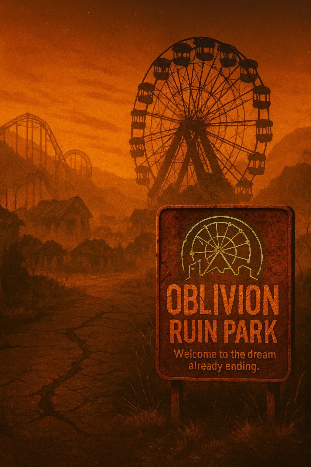 Oblivion Ruin Park is a vast theme park built on an abandoned Japanese village, designed by Oblivion Materials Inc, Its concept is simple yet disturbing: every attraction celebrates collapse, The Ferris wheel turns with flickering lights, the roller coaster sways on warped rails, and the pool slopes downward like a sinking floor, The haunted trail leads through real deserted houses and graveyards, echoing voices of a life long gone, Nothing here looks new—tickets are yellowed, maps are torn, and roads are cracked, It feels unsafe, yet it is carefully engineered to be secure, “Welcome to the dream already ending”: a playground for ruin lovers, urban explorers, and those who find beauty in decay, ‑not four-on-the-floor, ‑not 2-beat bass, ‑not cheerful pop, ‑not orchestral strings