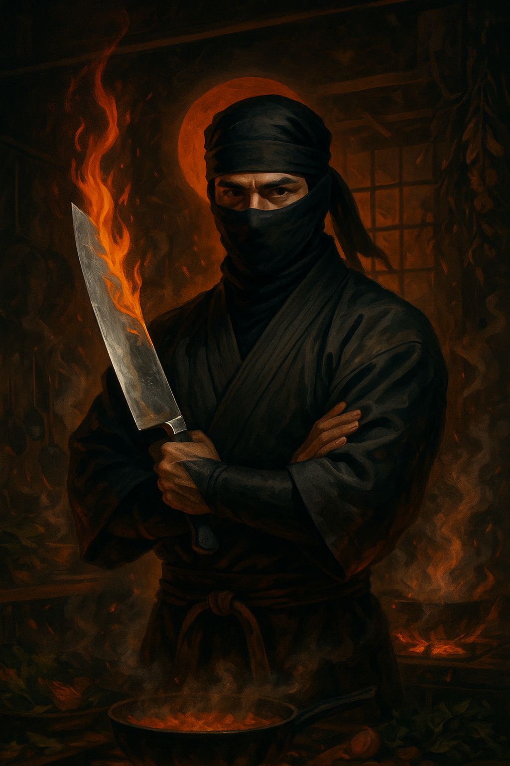 I stride into the moonlit kitchen, the floorboards creaking like taiko drums at 92 BPM, My voice cuts sharp, low, and deliberate, layered over shamisen plucks twisted with distorted bass and the hiss of sizzling oil, Every beat is a knife strike, every rest a pause before the next attack, This is ninja funk — a stealthy fusion of funk groove, lo-fi hip-hop, and traditional Japanese scales, spiced with sudden bursts of percussion like thrown kunai, I sing not just of food, but of survival, seasoning each word with the heat of my breath and the scent of sesame oil, The air is thick with steam, danger, and the promise of flavor, ‑auto-tune pop vocals, ‑mariachi horns, ‑disco strings, ‑tropical steel drums, ‑EDM build drops, ‑country banjo