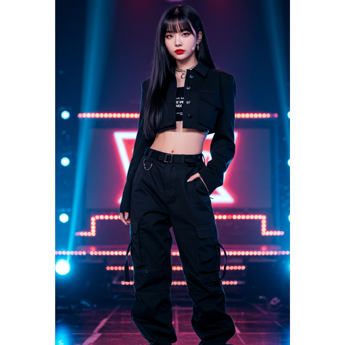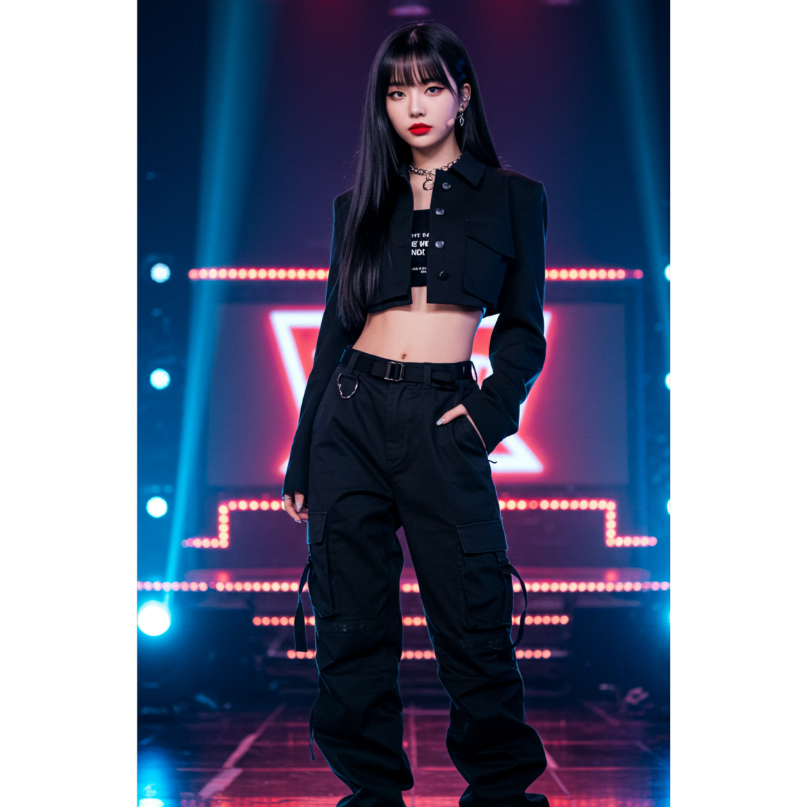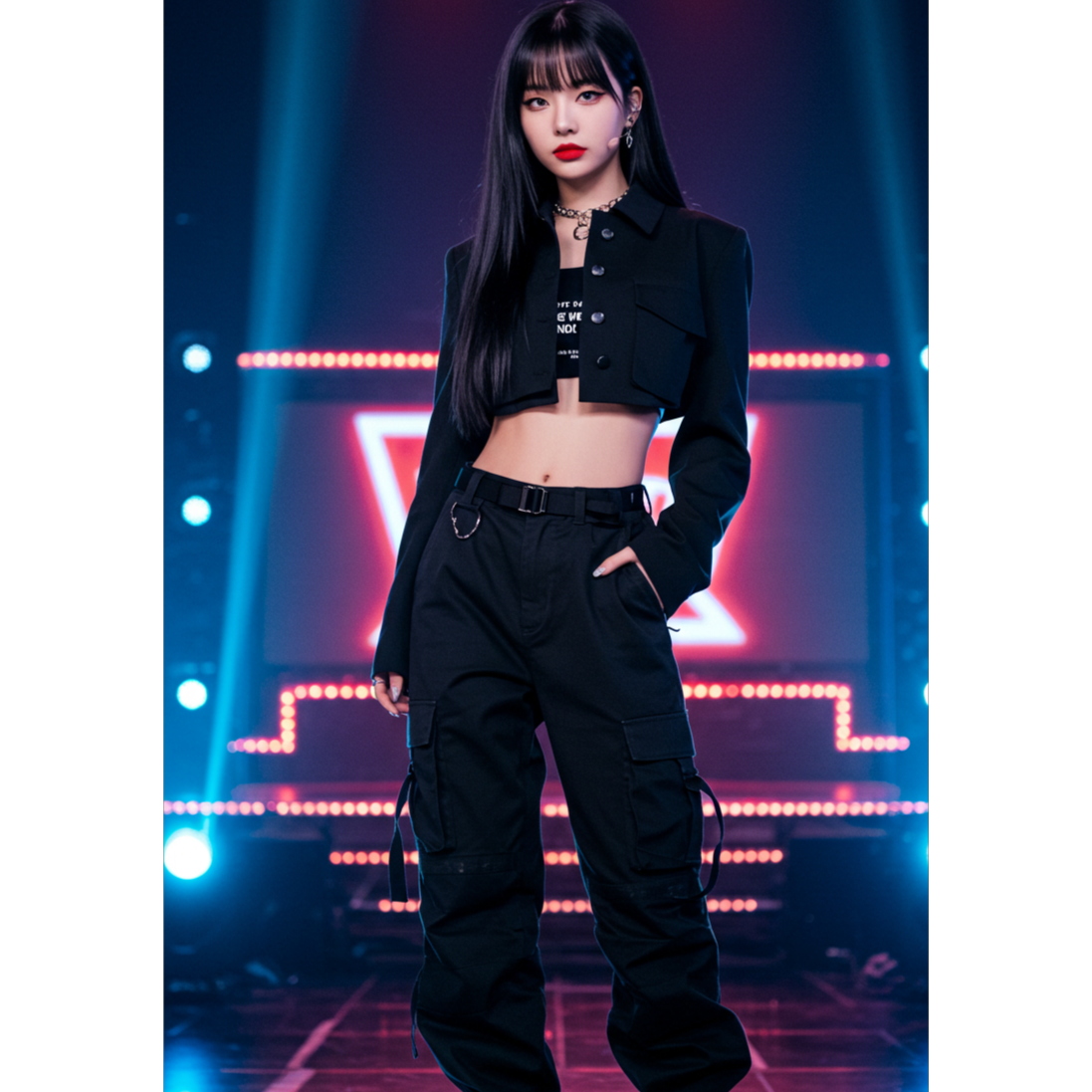 Style: K-pop signature fusion — sleek electro-pop layered with trap percussion and synth stabs, 128BPM energy build, dynamic verse-pre-chorus-chorus progression, dual vocal textures (soft x fierce), high-precision female vocals, clean yet climactic hook line