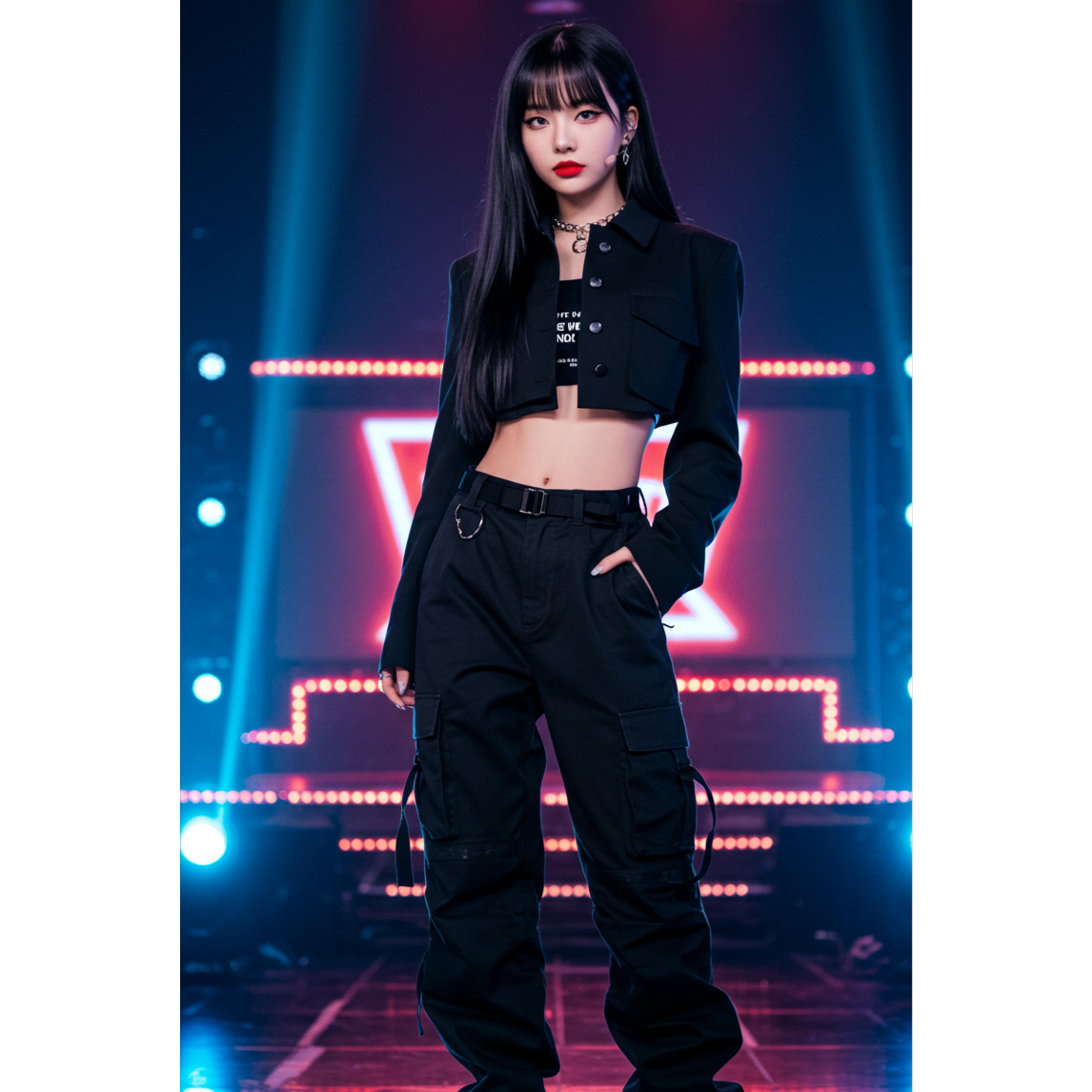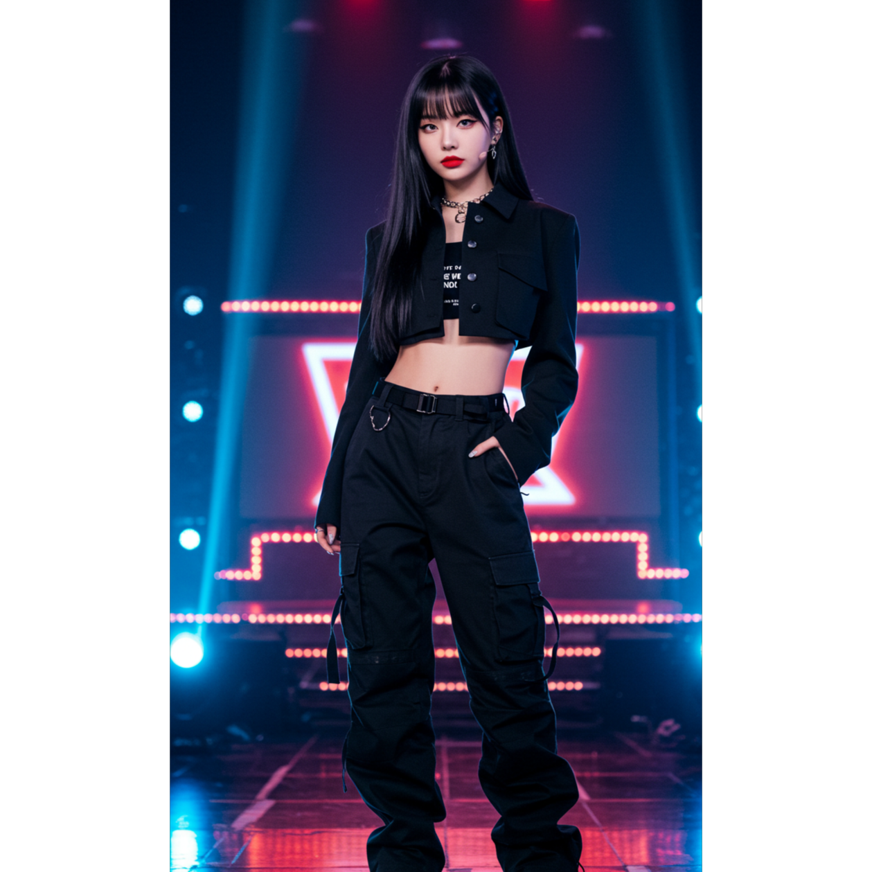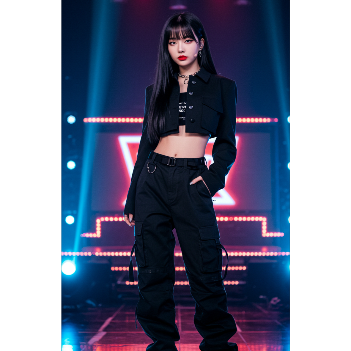 Style: K-pop signature fusion — sleek electro-pop layered with trap percussion and synth stabs, 128BPM energy build, dynamic verse-pre-chorus-chorus progression, dual vocal textures (soft x fierce), high-precision female vocals, clean yet climactic hook line
