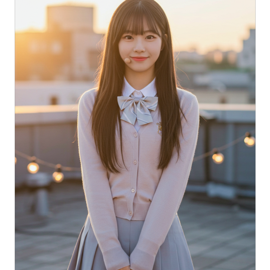 Mid-tempo Japanese pop ballad, 96BPM, Bright and rhythmic clean electric guitar riff (repeating as Hook, not sung), Soft ambient pad, light acoustic harp textures, and minimal kick/snare groove (brush style) to provide subtle bounce, Intro and Outro are instrumental only, designed to convey warmth and emotion without vocals, Youthful Korean female vocals (age 17–19), soft and breathy in verses, full chest voice in choruses, No falsetto, No robotic tone, No vocal switching, Overall tone must feel emotionally fresh, uplifting, and cinematically heartfelt