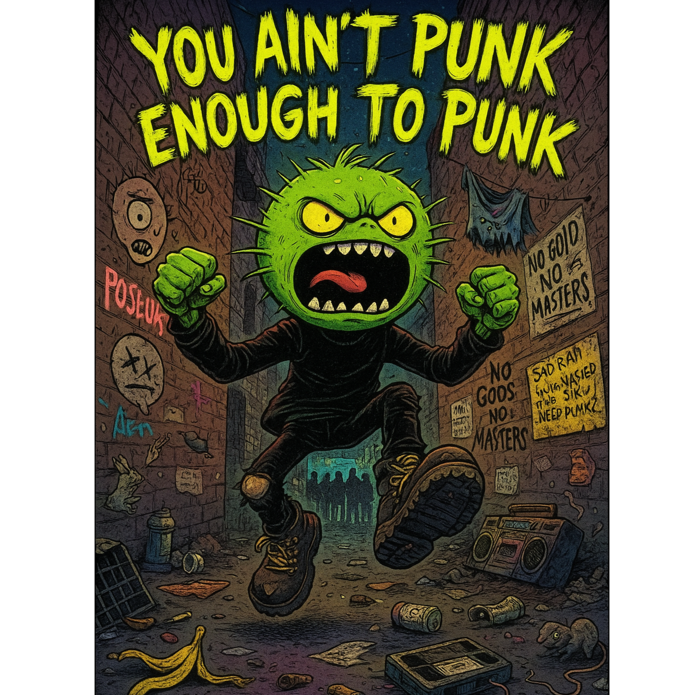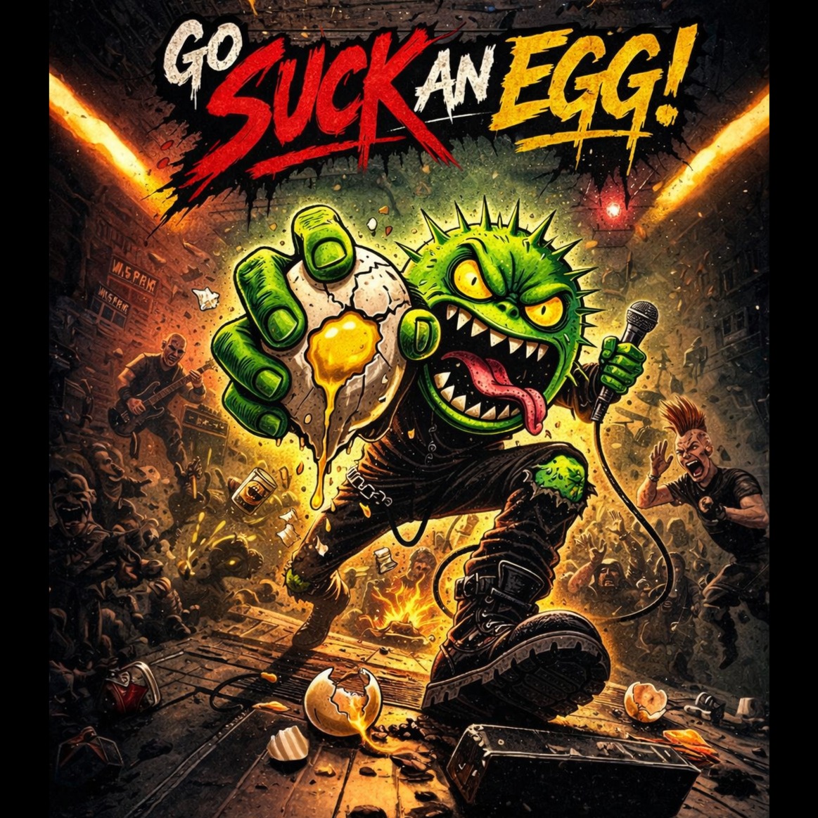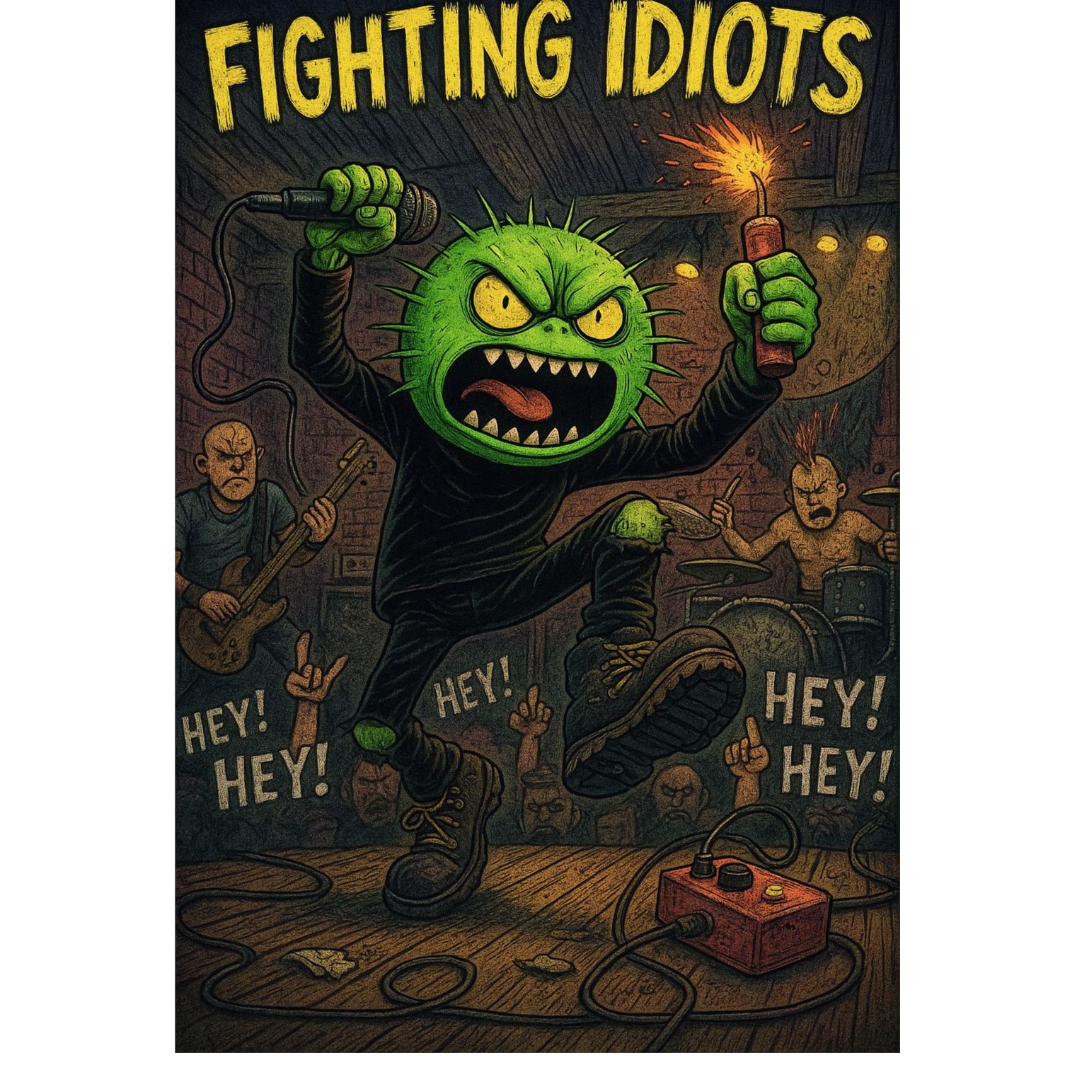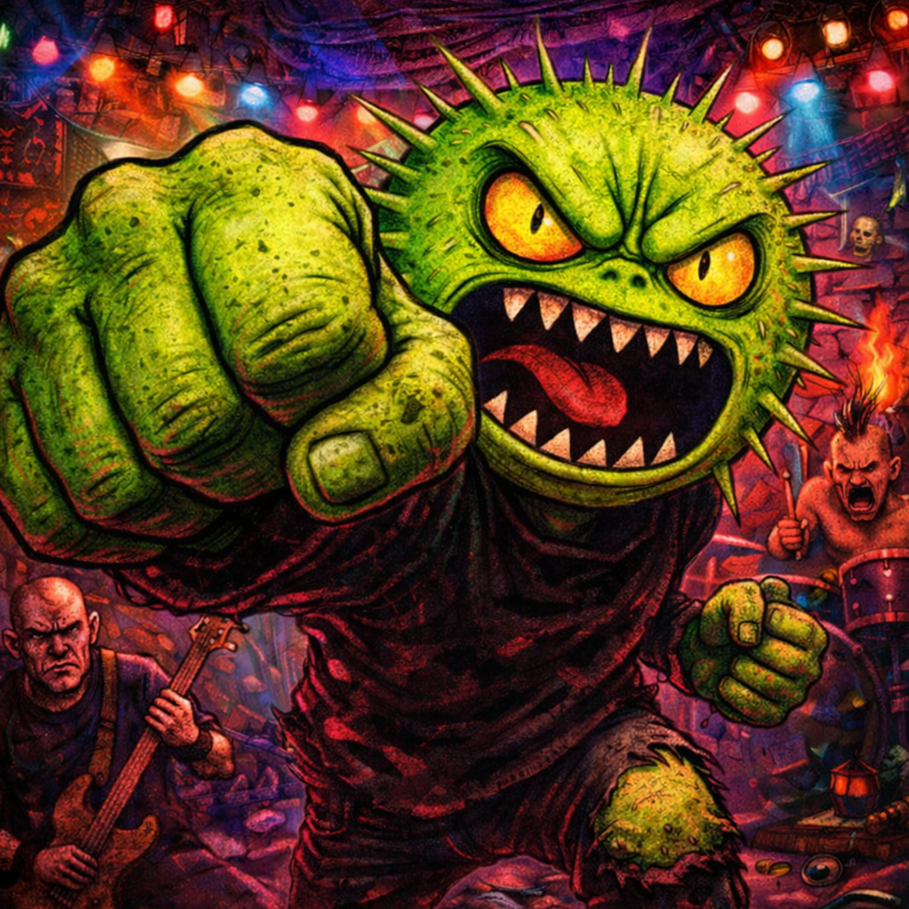 Raw, gritty live punk track ignites with two overdriven guitars, one snarling rhythm, one wild lead, battling over a punchy, distorted bass and relentless, crashing drums, Gang shouts and confrontational shouted vocals ride the chaos, Unpredictable dynamic drops pivot to frenzy; real crowd noise, amp hiss, and rough edges all preserved, Roomy, mid-heavy mix, A tongue-in-cheek acoustic guitar outro strips back the distortion for a quick, mocking close