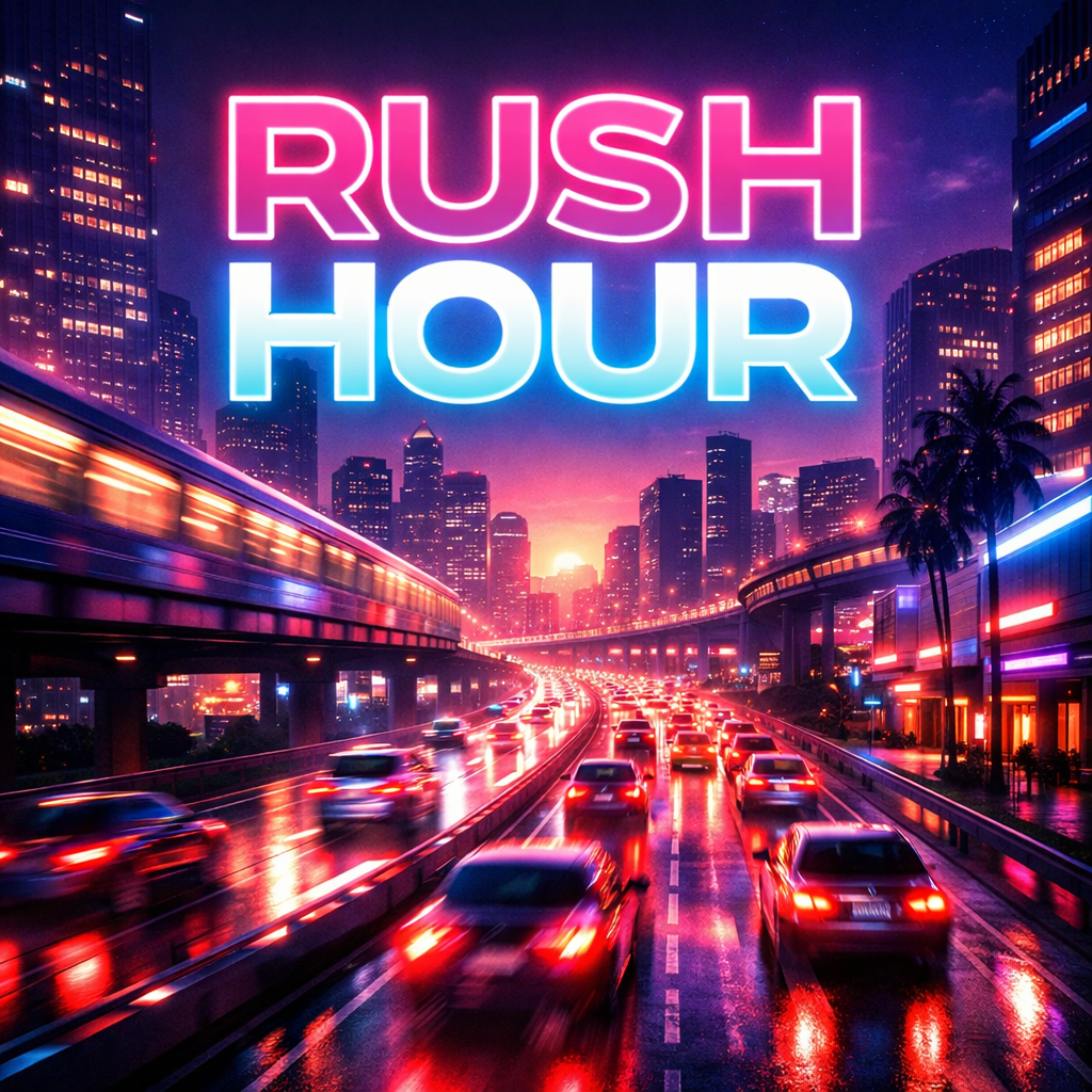[INSTRUMENTS:] heavy analog bass, pulsing kick, tight snare clap, rolling hats, rumbling sub, distorted bass stabs, cold arps, minor-key neon leads, metallic foley, data crackle, radio-scan hiss, glitch bursts, risers, cinematic impacts
