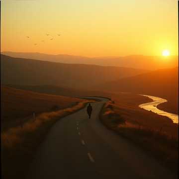 Mid-tempo roots rock song with bouncy acoustic rhythm guitar and fingerstyle arpeggios, Warm male vocals with heartfelt delivery and subtle harmonies, Lyrics evoke rolling hills, evening skies, gentle streams, and winds, exploring solitude, reflection, and freedom, Organic percussion, light electric guitar accents, and soft harmonica create a nostalgic, earthy atmosphere, Emotional choruses contrast with contemplative verses, capturing rural melancholy and open-road storytelling