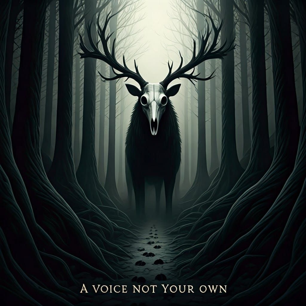 Dark industrial horrorcore, Ominous synth drones, distorted whispers, glitchy percussion, deep bass pulses, eerie choral chants, sharp scraping strings