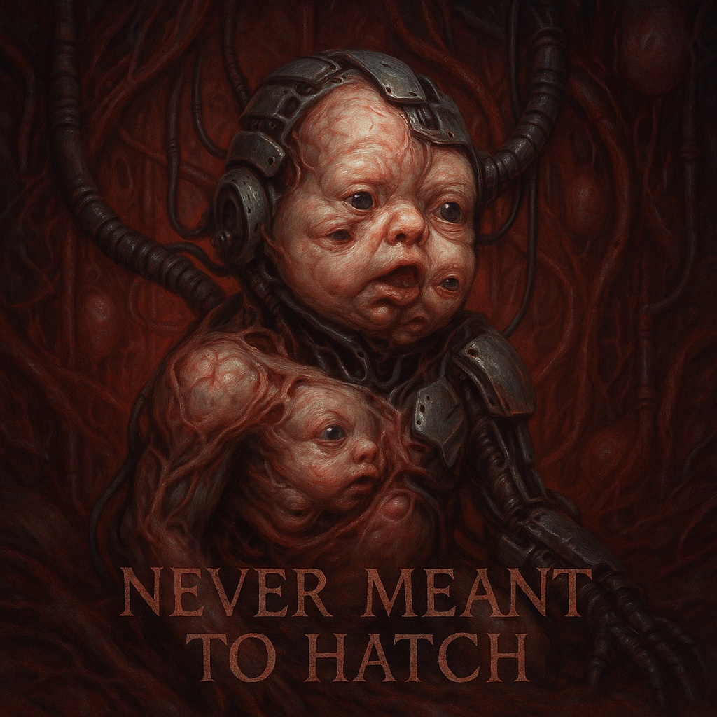 Industrial Lullaby, Ambient Horror, Detuned music box, glitchy synths, wet biomech pulses, reversed baby coos, distorted bass drones, soft static heartbeats