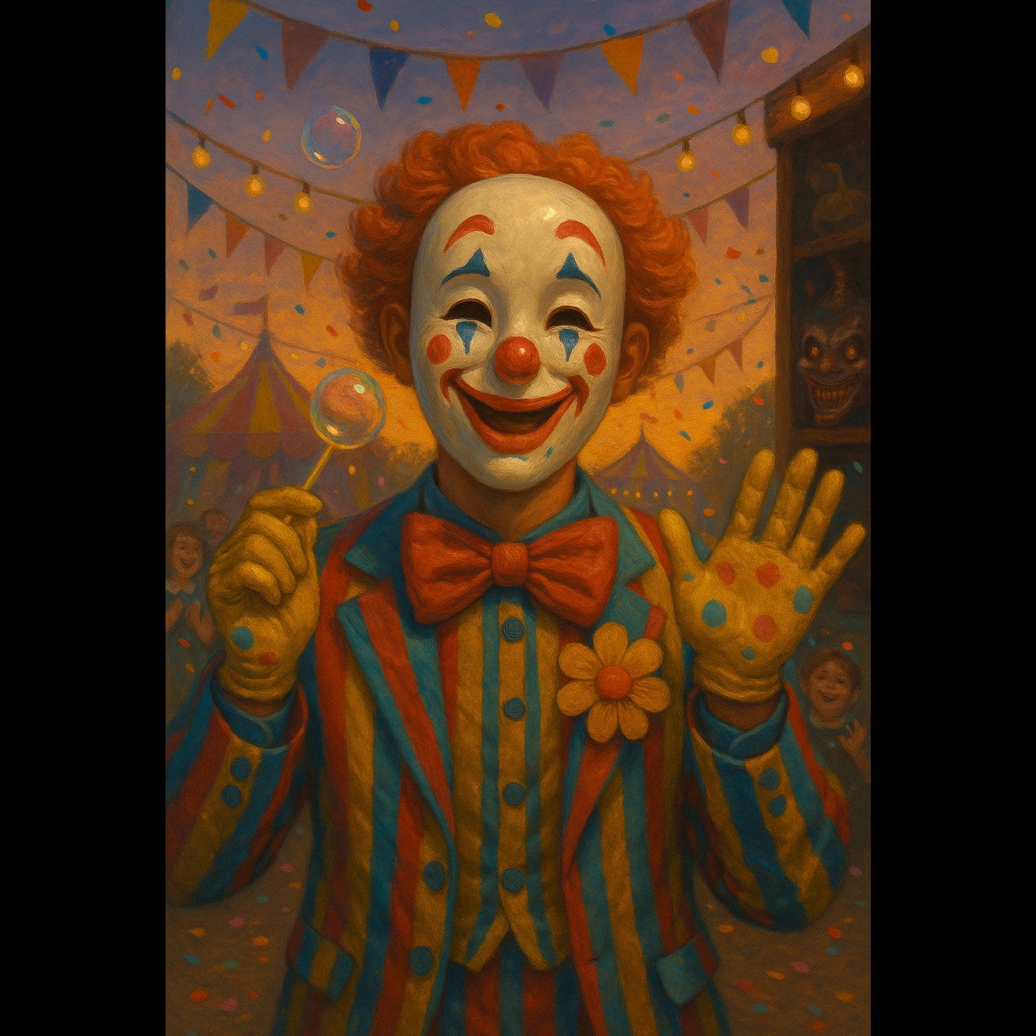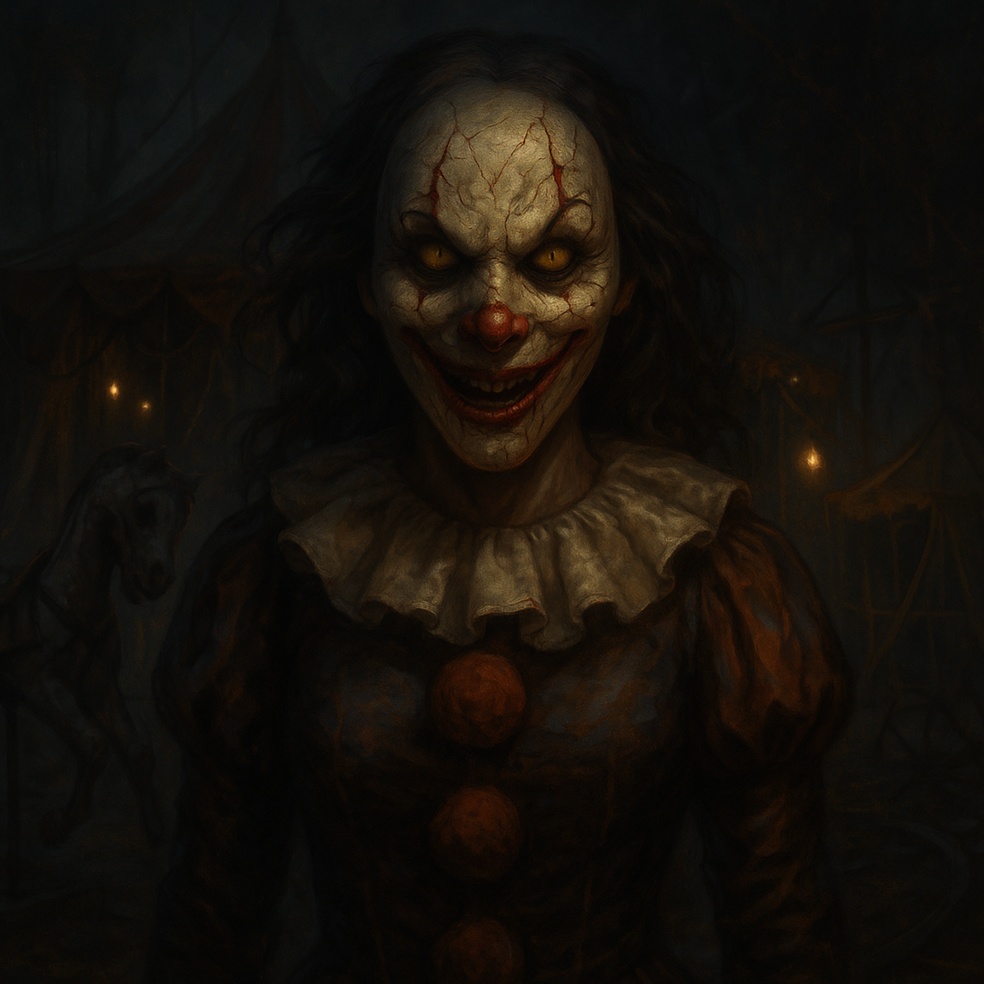 At 130 BPM, the song opens with layers of eerie calliope organ, detuned music box, and distant circus sounds, Slow, suspenseful transitions add toy piano and glitch effects, The first drop brings deep 808s, low brass stabs, and pounding mechanical drums while reversed laughter and chaotic FX swirl beneath, Male vocals twist from caustic cabaret sprechgesang to guttural horror trap, laced with evil adlibs and distorted layers, The breakdown explodes in circus chaos: polyrhythmic drums, mangled melodies, and feverish sound design that blur the line between macabre spectacle and nightmare groove