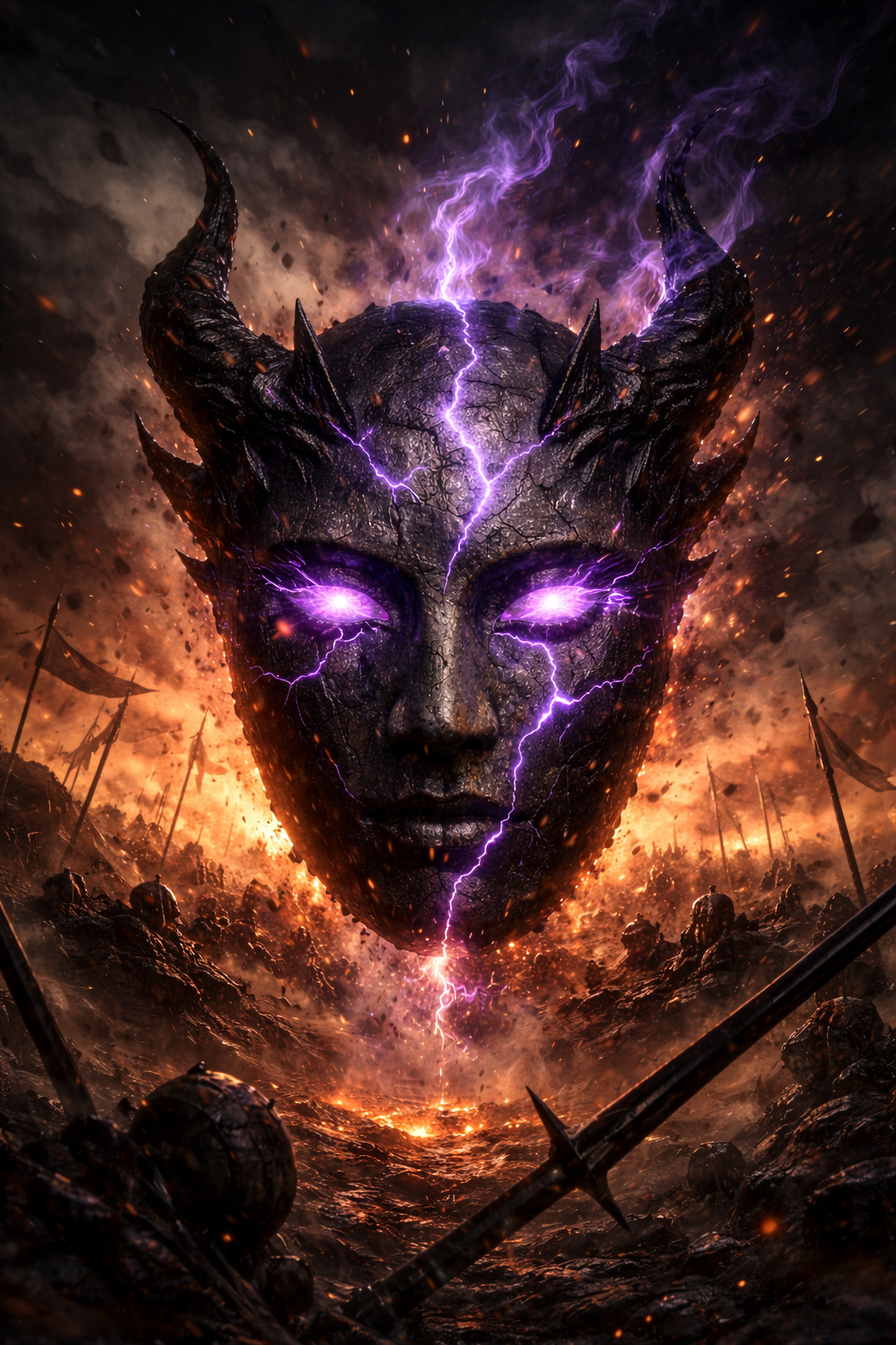A volcanic 140–150 BPM Epic Tribal Metal × Orchestral Hybrid erupts with pounding Taiko percussion, massive metal drum kit, and crushing electric guitars woven with deep brass blasts, Layers of cinematic strings and chanting choir rise over fiery riffs as a raw, deep male vocal leads, The choruses swell with ritualistic intensity, while breakdowns spotlight primordial percussion, glowing in dark red-orange orchestral textures before the finale ignites with a blazing wall of sound