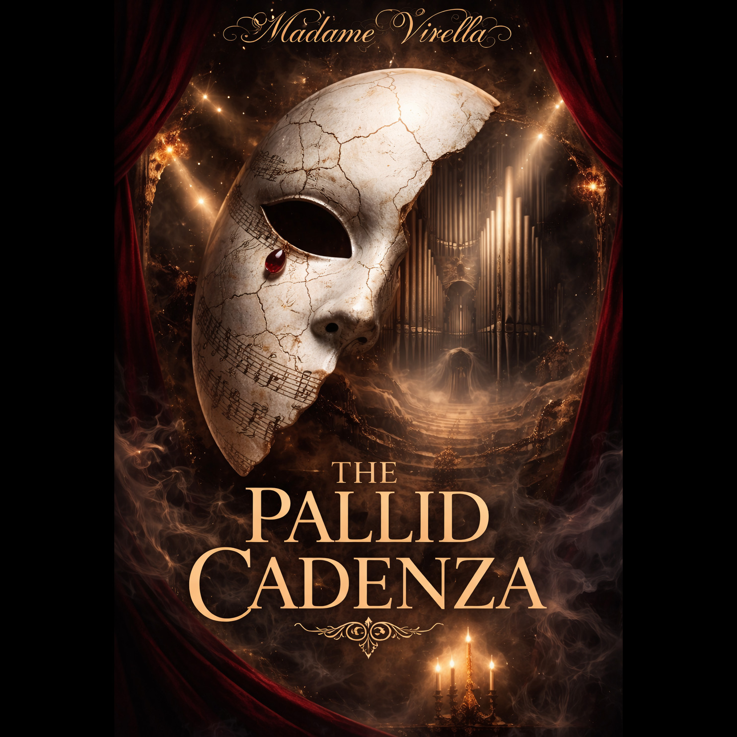 Style: Gothic opera + symphonic dark, cathedral pipe organ as main instrument (loud, dominant, constant presence), huge organ pedal bass, dramatic orchestral strings, operatic choir, cinematic percussion, minor key, heavy reverb, grand theatrical dynamics
