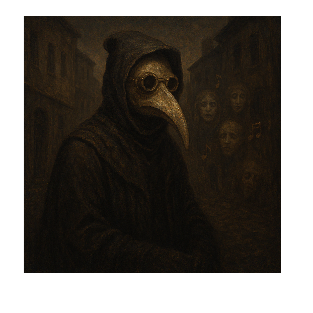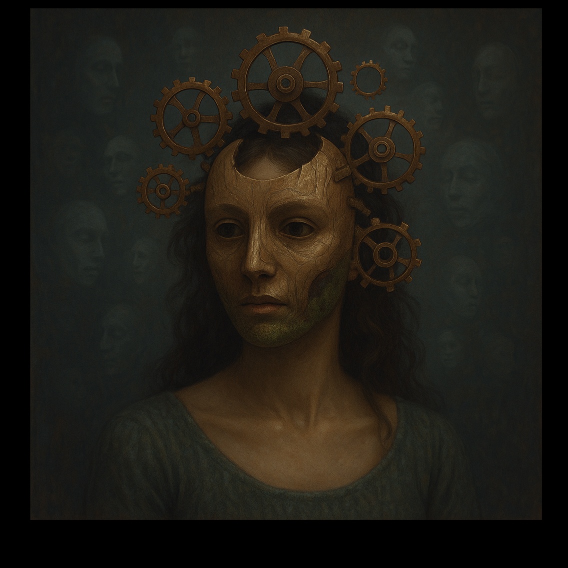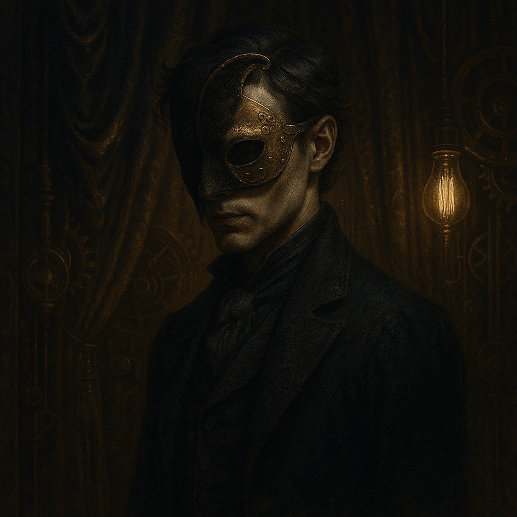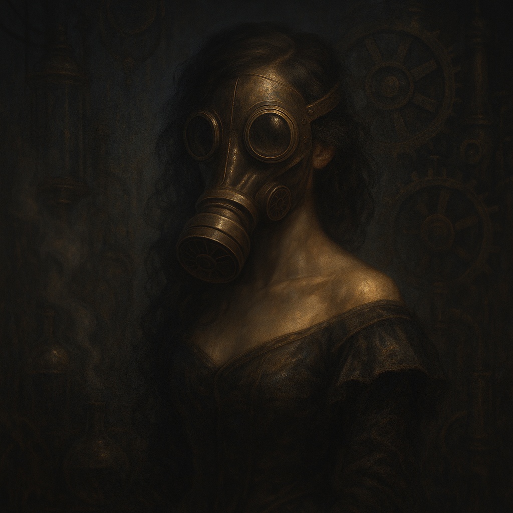 A dark steampunk opera ballad at 65 BPM, blending detuned piano, bowed metal, slow analog synth drones, deep sub-bass, and fragmented strings, Female vocal is metallic and gasmasked, with whispering interludes, ghostly echoes, choral distortion, and a pulsing breathing-machine rhythm