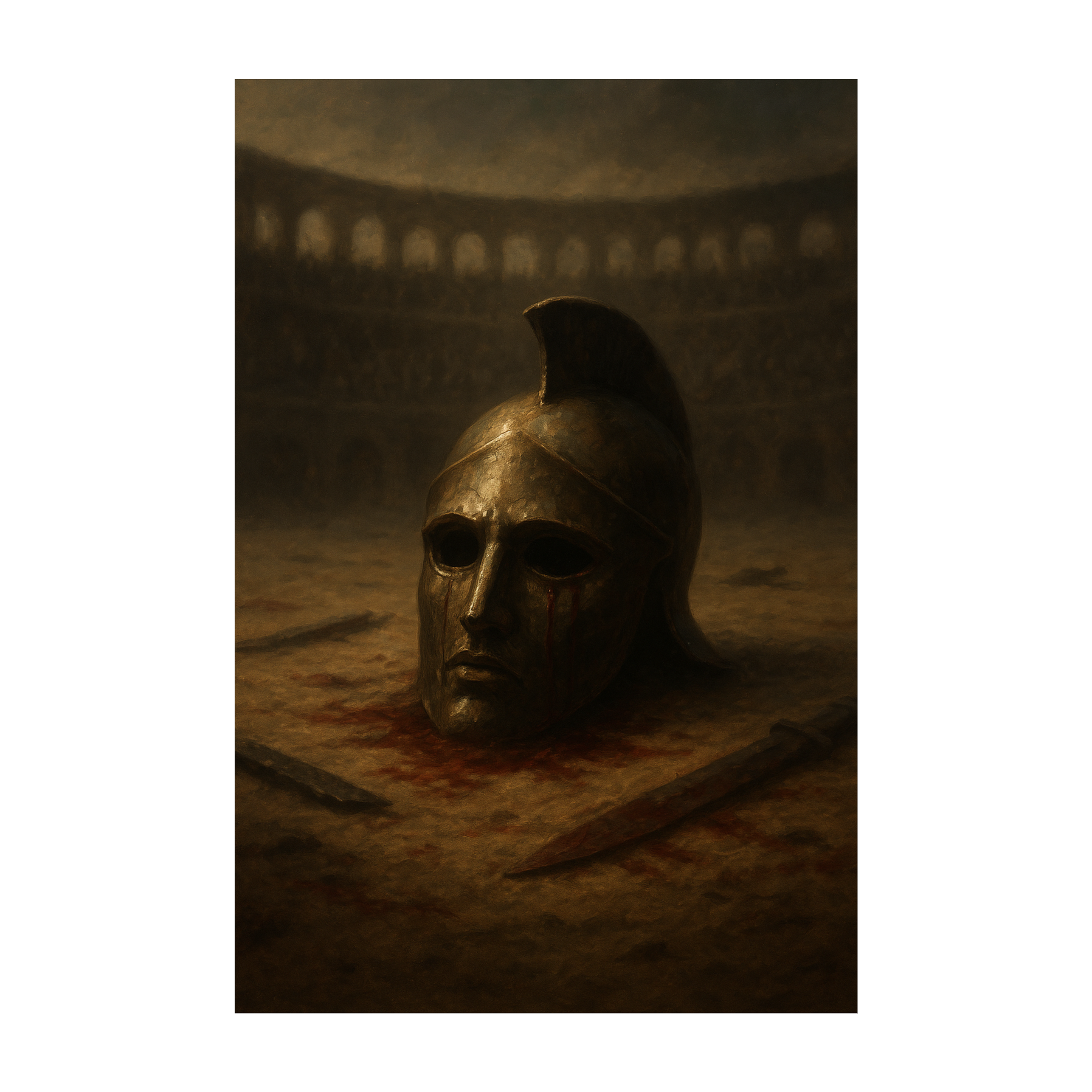 The song opens with thunderous war drums and deep strings, echoing beneath a vast amphitheater, Trumpets and ancient lyres intertwine, while a chanting male choir adds weight, The powerful deep male vocal surges with reverb, accented by echoing whispers, distant crowd cheers, sword clashes, and the spectral murmurs of fallen warriors, The mood remains ritualistic and tragic, unwavering in its gravity, building layer by layer to a somber, expansive climax