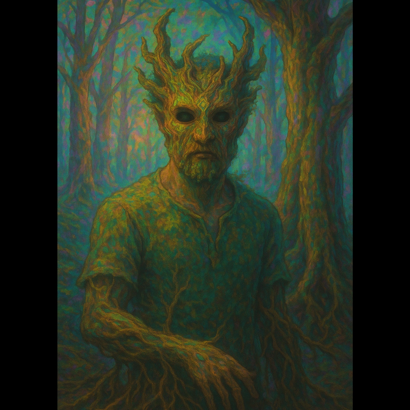 Opening with forest ambience—birds, thunder, wind, faint water drips—interwoven with sustained low string drones and resonant wooden percussion, Slow acoustic guitar, awash in reverb, creates hypnotic patterns, Subtle modular synths add swirling undercurrents, Deep, earthy male vocals intone solemnly, rooted and textured, surrounded by ethereal mixed-gender chorus harmonies, soft layered breaths, and murmured spoken phrases, all enveloped in a ritualistic, immersive folk-psychedelic drone tapestry
