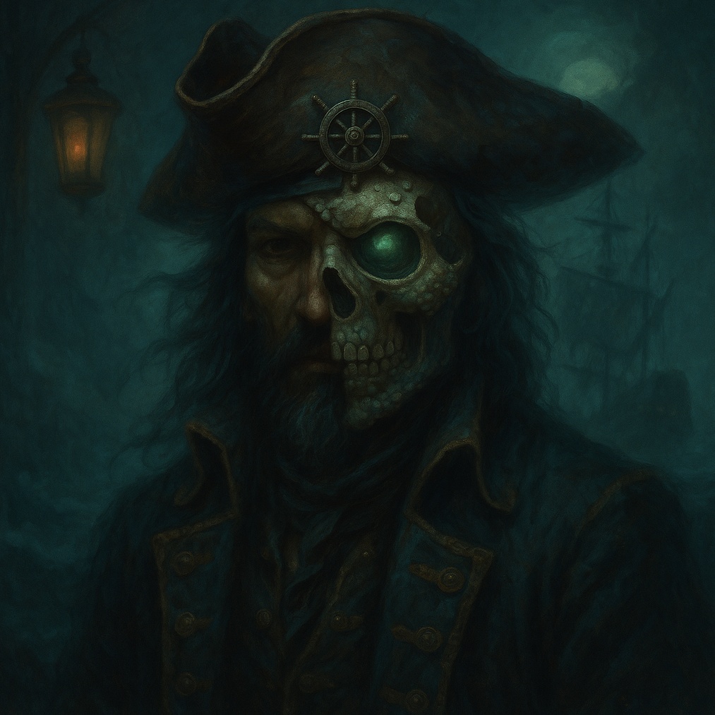 A dark sea shanty ballad in 6/8, led by deep, raspy baritone vocals with echoing ghostly harmonies, Accordion, stormy drums, strings, ambient wind FX, and creaky wood drive the verses, Foghorn brass and distant cannon-like reverb punctuate cinematic choir swells for epic ghost pirate atmosphere