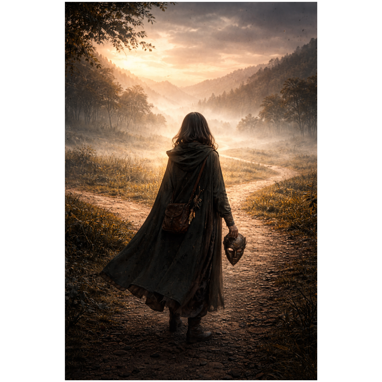 Opening on gentle harp arpeggios and an ambient drone, atmospheric FX paint the setting—soft footsteps, wind, and faint market voices drift in, Wood flute introduces a wistful melody, supported by expressive violin lines, Subtle soft percussion hints at a wandering heartbeat, Female lead sings in an airy, storyteller tone, layered with ethereal harmonies, Each section breathes with 3/4 phrasing, building cinematic swells and tapered introspection, balancing folk textures and lush, world-inspired sonics