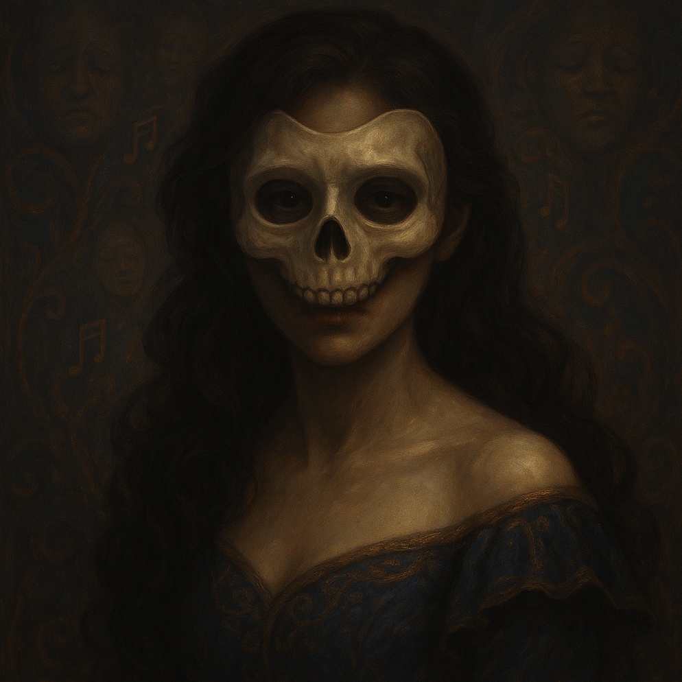 A gothic waltz in 3/4 at 72 BPM, opening with celesta and a broken music box motif, layered with cinematic strings and warm sub-bass, Ethereal, melancholic operatic female vocals float above, supported by glitchy ambient textures, synth pads, distant bell chimes, and processed vocal echoes, Mood: fragile, tragic, elegant, decaying