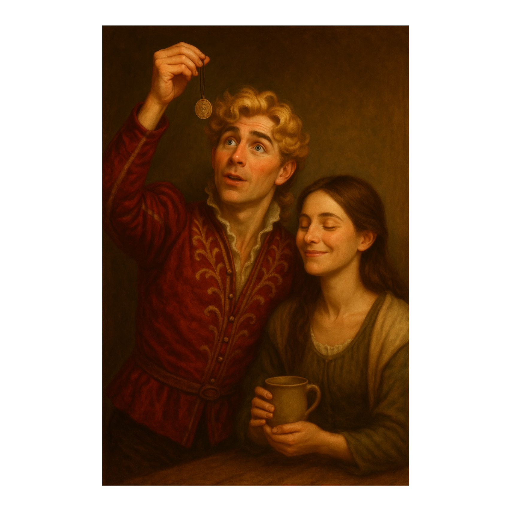 An expressive, overdramatic male vocal weaves through baroque-folk textures at a lightly skipping 80–90 BPM, Clavichord leads, supported by light strings, lute, and subtle winds, Playful orchestration underpins the verses, with dynamic shifts, Mid-song, harpsichord and solo violin trade theatrical lines in a whimsical interlude before gently returning to the core ensemble