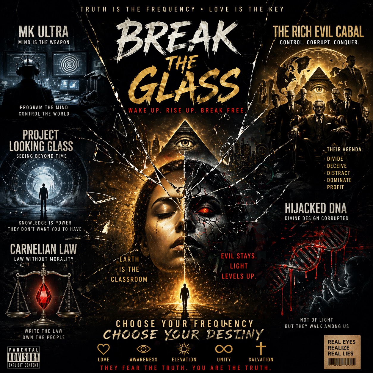 Cinematic Conscious Rap / Dark Electronic Hip-Hop, 92 BPM, Key D Minor, Deep Sub Bass, Glitch FX, Atmospheric Pads, Minimal Piano Notes, Slow Heavy Kick + Snare, Trap Percussion Layers in Drop, Female Ethereal Vocal Layer in Bridge, Spoken Word Intro/Outro, Tension Build to Anthem Chorus, Dark Futuristic Mood, Clean Modern Mix, Documentary + Revelatory Energy