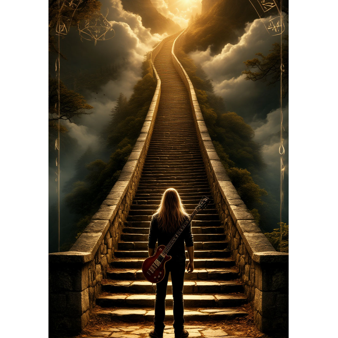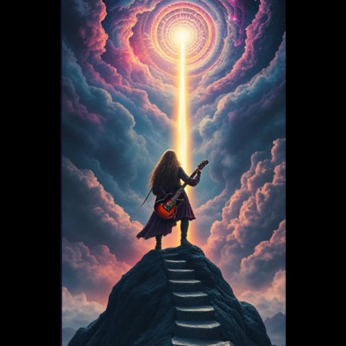 A mystical progressive rock ballad inspired by Led Zeppelin’s “Stairway to Heaven (Live)”, The song starts softly with fingerpicked acoustic guitar and minimal percussion, gradually building into a powerful, electrifying climax with soaring electric guitar solos and explosive drums, Lyrics are poetic, enigmatic, and spiritual — exploring the search for meaning, dreams, illusions, and inner fire, The vocal starts gentle and haunting, becomes emotionally intense by the final section, Instruments: acoustic and electric guitar, live drums, analog bass, layered atmospheric vocals, Structure: slow acoustic intro (6/8), mid-tempo build (4/4), epic climax, soft outro, Mood: introspective, mystical, powerful, Style: 1970s live classic rock, with elements of British folk and psychedelic rock, Emphasis on live energy, dynamic contrast, and emotional depth