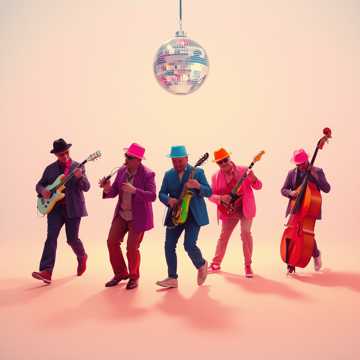 Upbeat marching band x funky house, funky techno, minimal techno, Chillout jazz, upbeat vibes, acoustic guitar