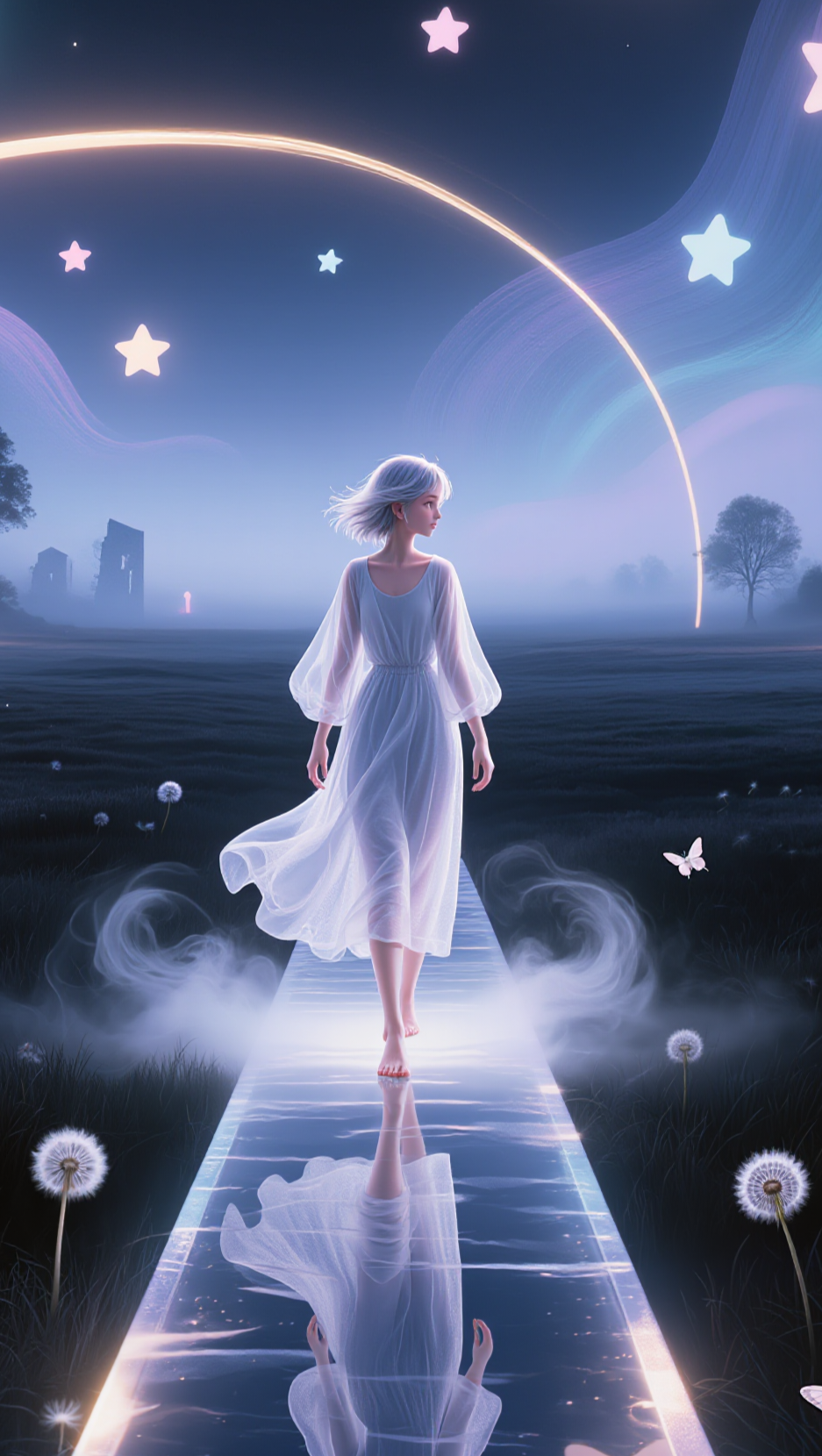 The song is a synth-pop ballad with a melancholic yet hopeful atmosphere, It features a female vocalist with a clear, ethereal tone, often employing a breathy delivery, The instrumentation primarily consists of synthesizers, creating a lush, atmospheric soundscape, A prominent synth pad provides a sustained harmonic bed, while a arpeggiated synth line adds rhythmic and melodic interest, A subtle, almost whispered percussion track provides a gentle pulse, occasionally punctuated by a soft kick drum, The chord progressions are generally slow-moving, emphasizing minor keys to convey a sense of longing, The melody is lyrical and flowing, with a moderate tempo, Production elements include reverb on the vocals and synthesizers, contributing to the expansive feel, The song structure follows a typical verse-chorus format, with instrumental breaks that maintain the atmospheric quality, The overall mix is balanced, allowing the vocals to sit clearly above the instrumental arrangement