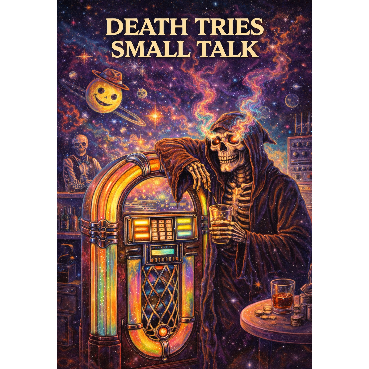 Psychedelic rock with a stronger rock backbone: crunchy vintage guitars, driving bass, upbeat mid-tempo groove, and playful spacey analog synths, Light-hearted, humorous, and absurd lyrics with dry cosmic wit, Colorful, energetic, and whimsical, blending classic psychedelic rock vibes with a friendly, surreal take on Death as a conversationally awkward observer of the universe