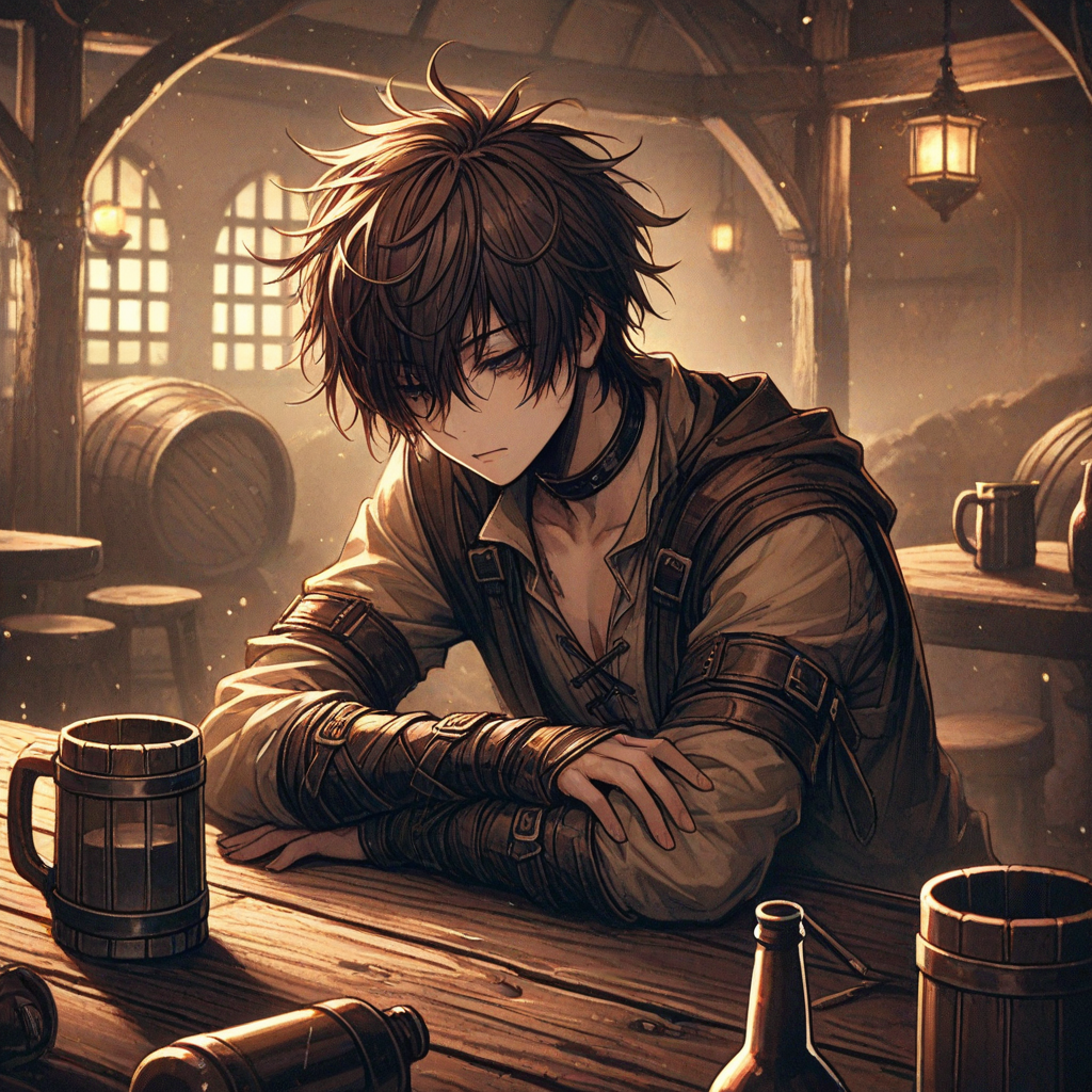 A slow, melancholy folk-inspired track with soft acoustic guitar, gentle fiddle, and warm but somber harmonies, The rhythm is unhurried, like the quiet murmur of a dimly lit tavern at night, Subtle minor chords hint at regret and faded glory, while the instrumentation carries a rustic, medieval flavor, The mood is reflective and bittersweet, evoking the image of a once-great hero now drowning his past in drink, yet still carrying a faint ember of who he once was