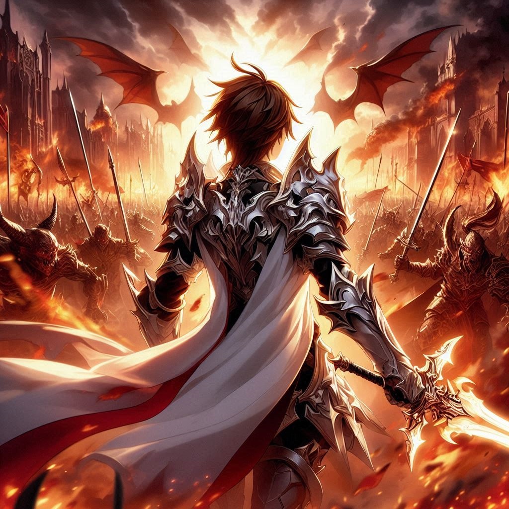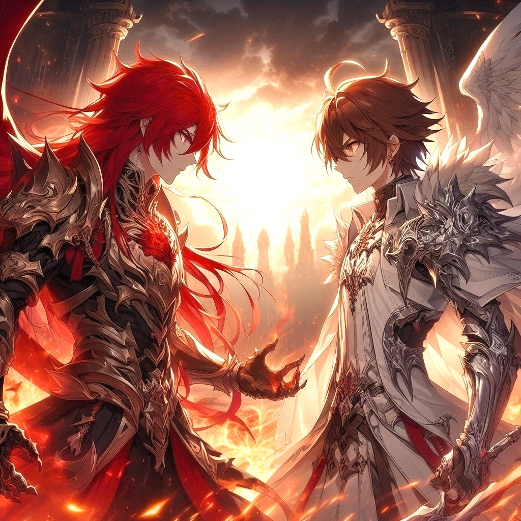 Epic and intense orchestral music for a climactic battle between the demon lord and the hero, Massive percussion, dramatic strings, soaring and dueling brass sections, powerful choir, furious tempos, electric guitar accents, moments of silence and explosive crescendos, light and darkness clashing, an overwhelming sense of destiny and final confrontation—grand, emotional, and cinematic, perfect for the ultimate showdown