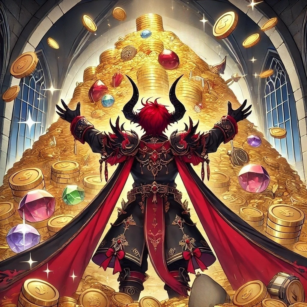 Playful and triumphant orchestral music for a villain celebrating their loot, Upbeat brass, sparkling strings, mischievous woodwinds, bouncy percussion, and glittering sound effects evoke the thrill of victory and the joy of newfound riches, The mood is cheeky, exuberant, and filled with comic bravado—perfect for a scene of gleeful gloating surrounded by piles of treasure