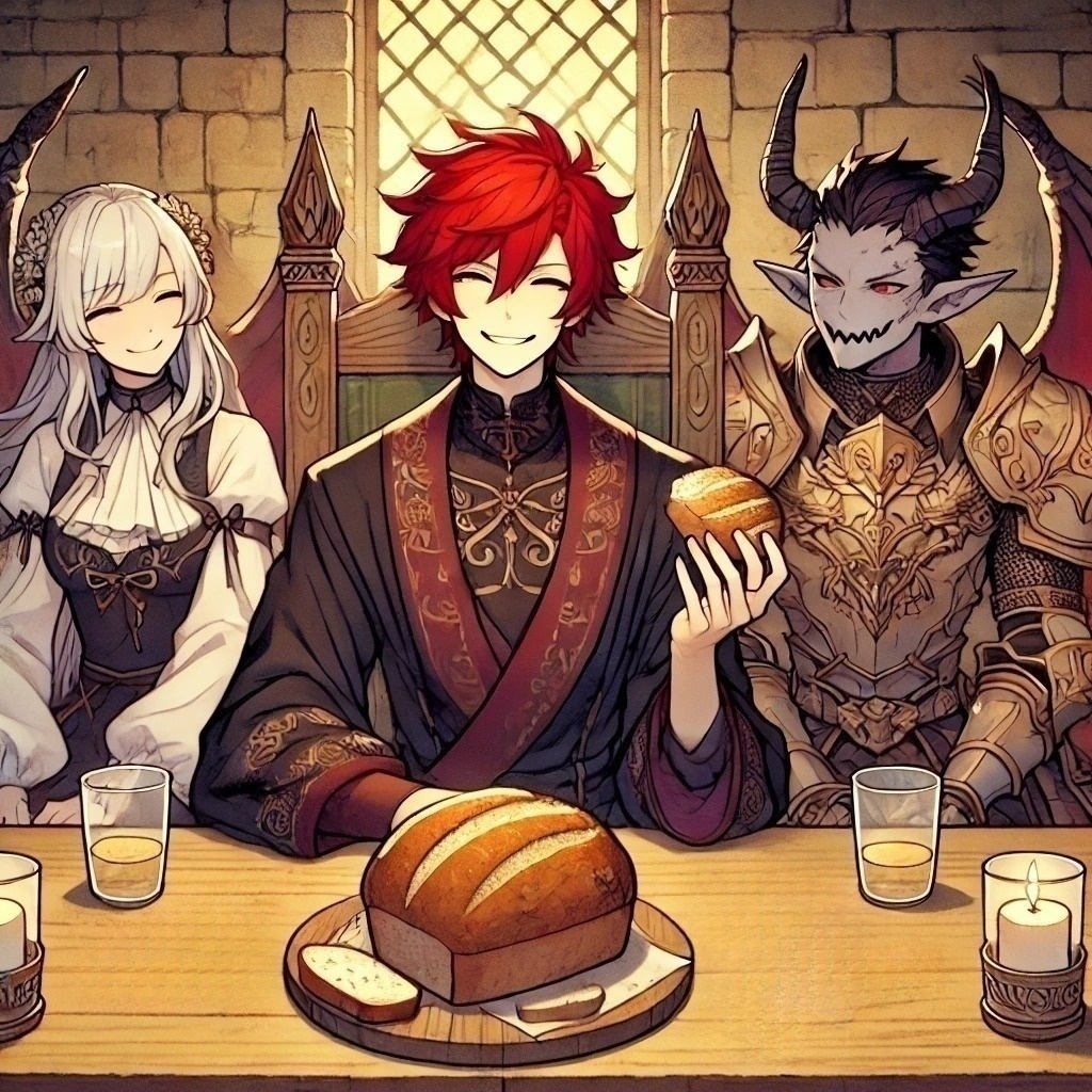 A cheerful and bustling market theme with upbeat folk instruments, light tambourine, and warm acoustic guitar, The melody is catchy and friendly, carried by lively flutes and playful strings, evoking a sunny day in the capital where people laugh and children run to buy the famous “Demon Lord Bread, ” Subtle quirky notes hint at its unique origin, but the overall feel is joyful, festive, and full of charm