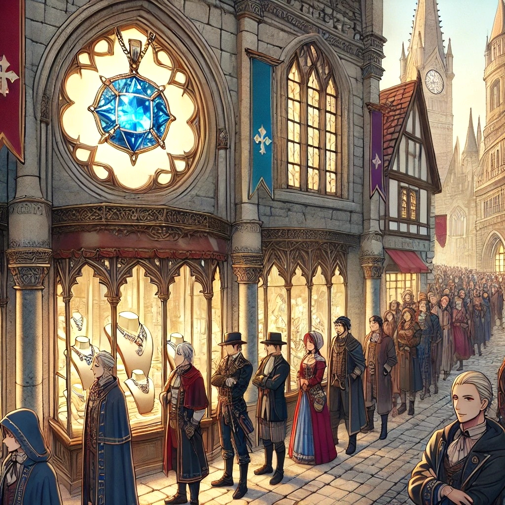 A lively and bustling orchestral piece with playful woodwinds, bouncing strings, and energetic percussion, The rhythm captures the clamor of a crowd rushing and chattering, while bright brass flourishes and fast melodic runs evoke excitement and impatience, The tone is cheerful but slightly chaotic, as if joy and frenzy mix together in the marketplace, Perfect for depicting a long line of townspeople eagerly competing to buy the same coveted pendant