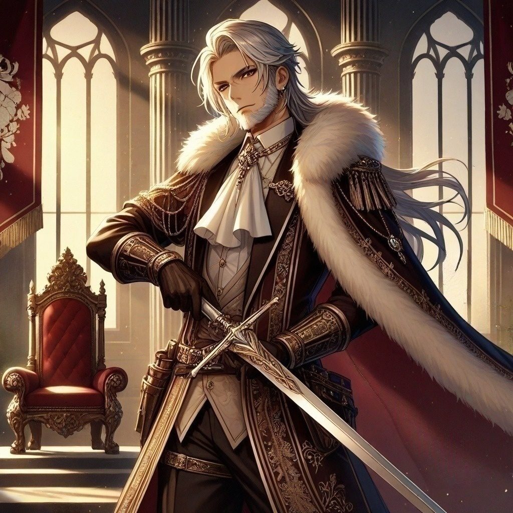 A stately and commanding orchestral track with steady timpani, deep brass, and resolute strings, The tempo is moderate, conveying measured authority rather than haste, The harmony stays in a firm minor key, adding weight and seriousness without slipping into darkness, Occasional trumpet fanfares punctuate the music like royal decrees, while a low choir underscores the king’s unshakable resolve to restore order and discipline