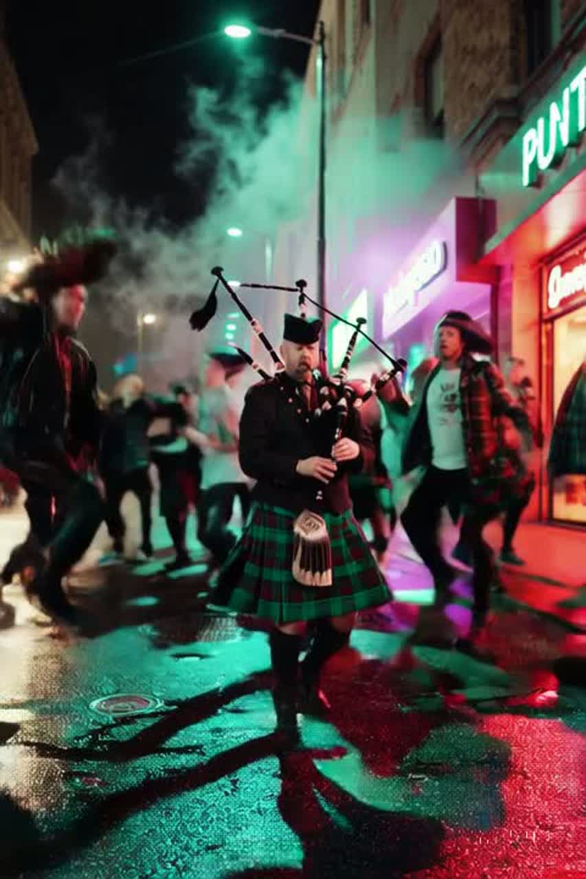 Celtic street-punk (180 BPM, 4/4): roaring highland bagpipes lead, crunchy distorted guitars in A-Mixolydian, driving snare rolls and pogo bass, crowd-chant gang vocals; halftime bridge then full-speed outro burst, ‑folk pop, ‑indie rock, ‑ballad, ‑reggae, ‑synthwave, ‑funk