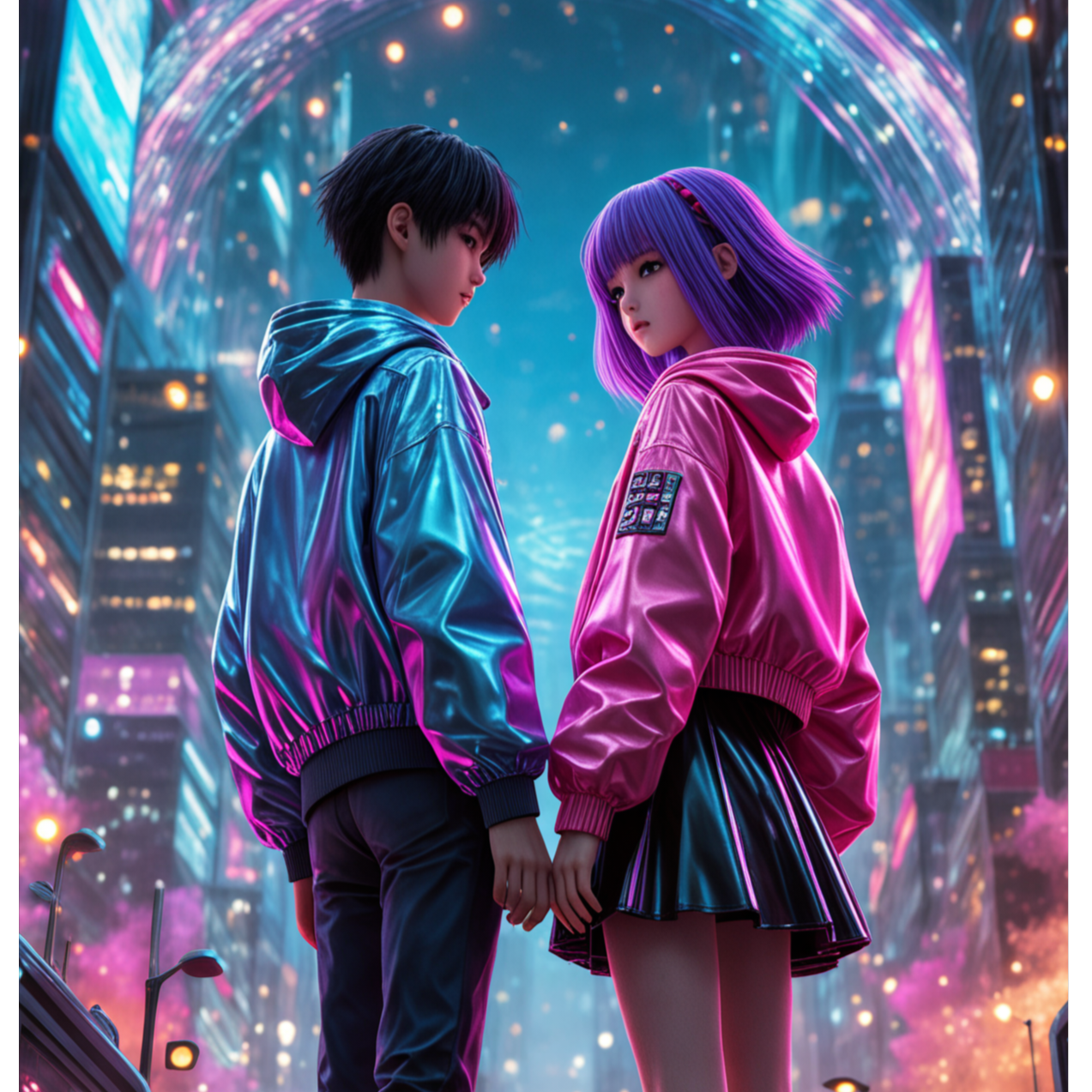 Duet Vocals Create a high-energy track titled “A Boy and a Girl” blending Pop, Experimental Electronic, Hip-Hop, Drum & Bass, Dubstep, Hardstyle, Rock, and EDM, Vocal style should feature vocoder effects and convolution reverb, with sections of whispered samples and rhythmic chant, Instrumentation must include deep synth basslines, glitch textures, heavy drums, distorted guitar riffs, and ambient transitions, The mood is cinematic, rebellious, and emotionally charged: a digital love story in a chaotic futuristic city, Structure the song with intro, verses, chorus, rap break, bridge, instrumental break, and ambient outro, Use dynamic BPM shifts and layered harmonies to build drama and pulse, Lyrics should express themes of youth, connection, chaos, and timeless passion inside a digital landscape